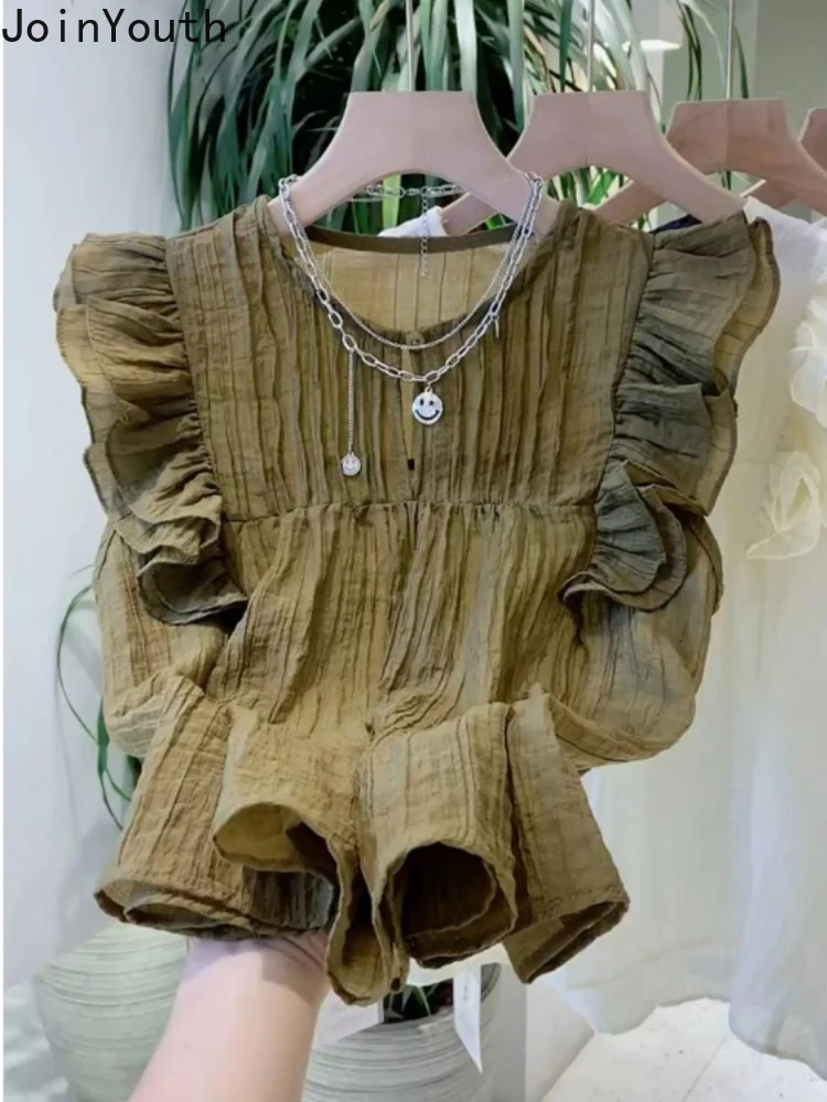 Chemisiers blancs à col rond pour femmes, chemises à volants, chemisier d’été vintage, mode 2025
