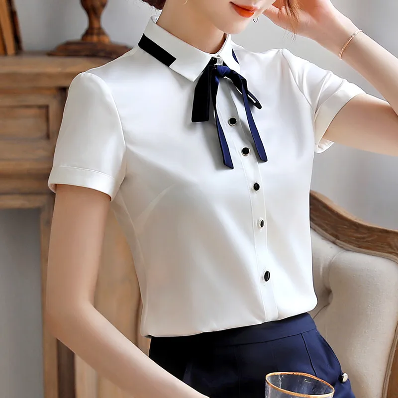 Chemisiers en mousseline de soie à manches courtes pour femmes, chemise élégante avec nœud, mode décontractée pour dames de bureau, Y-Baratas |