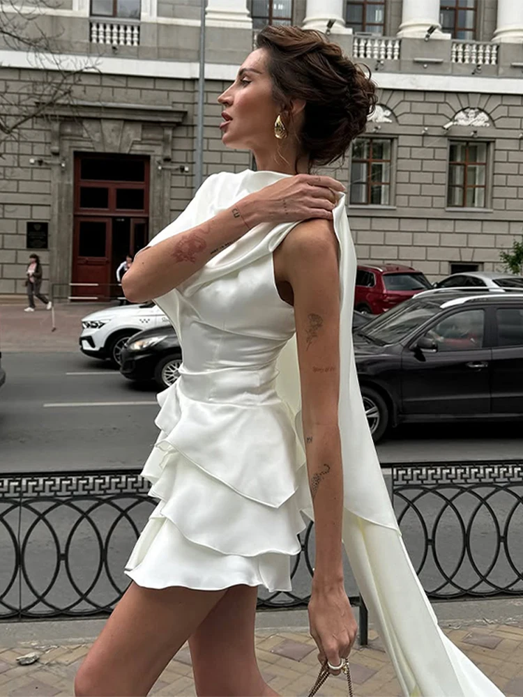 Chic châle courte robe licou femme couleur unie taille cintrée pile robes plissées Unique élégant femmes mode Mini robes |