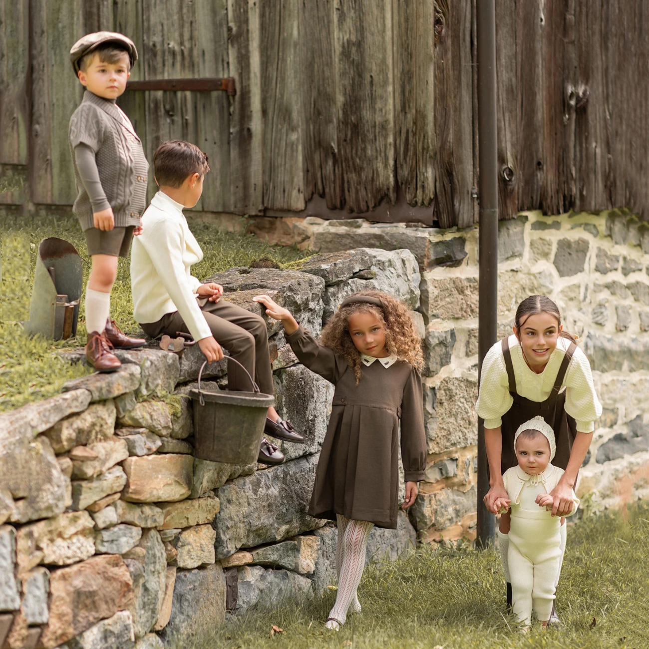 | Couleur | brown boys pants, brown modal top, brown overalls short, girls dress, girls skirt, girls sweater, off-white blazer, off-white modal top |
