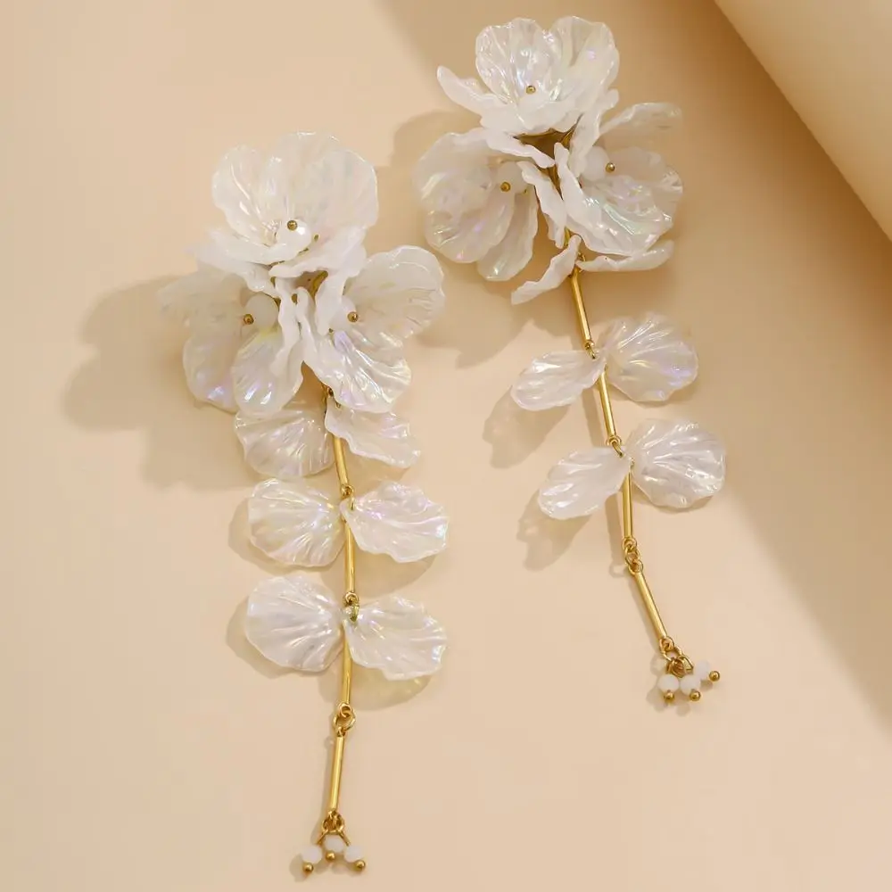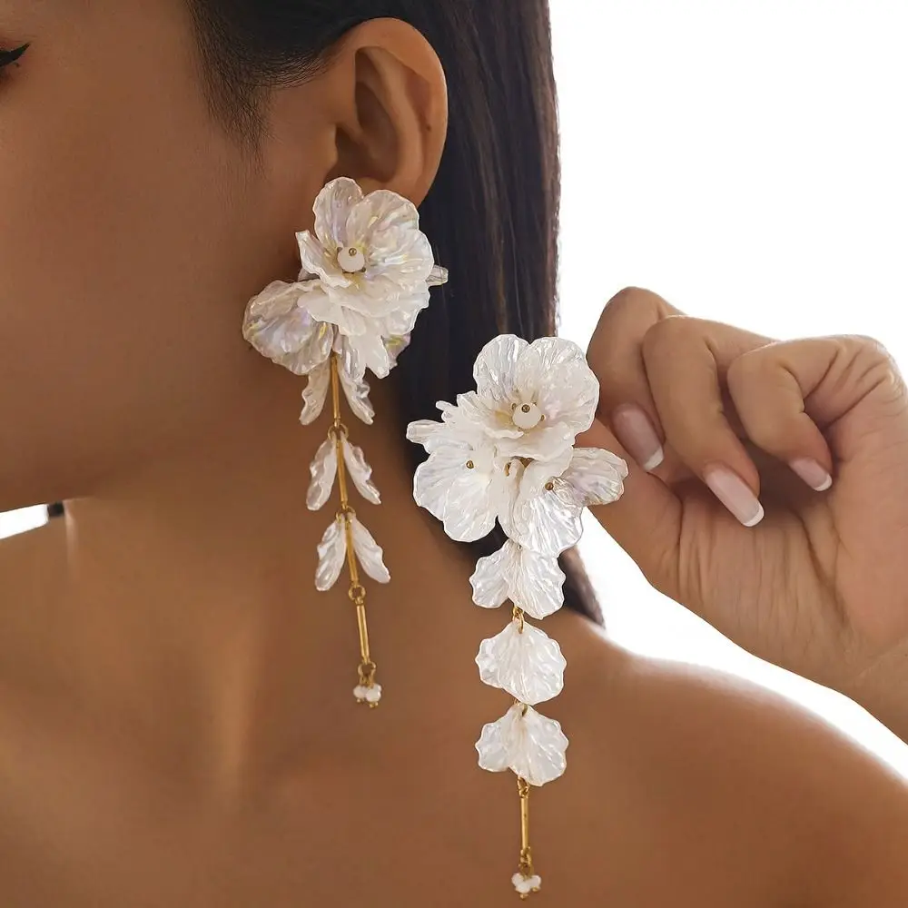 Collier de fleurs 3D élégant, boucles d’oreilles de luxe, pétales délicats, longs pompons, bijoux en fer et plastique, collier de clavicule à fleurs blanches