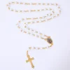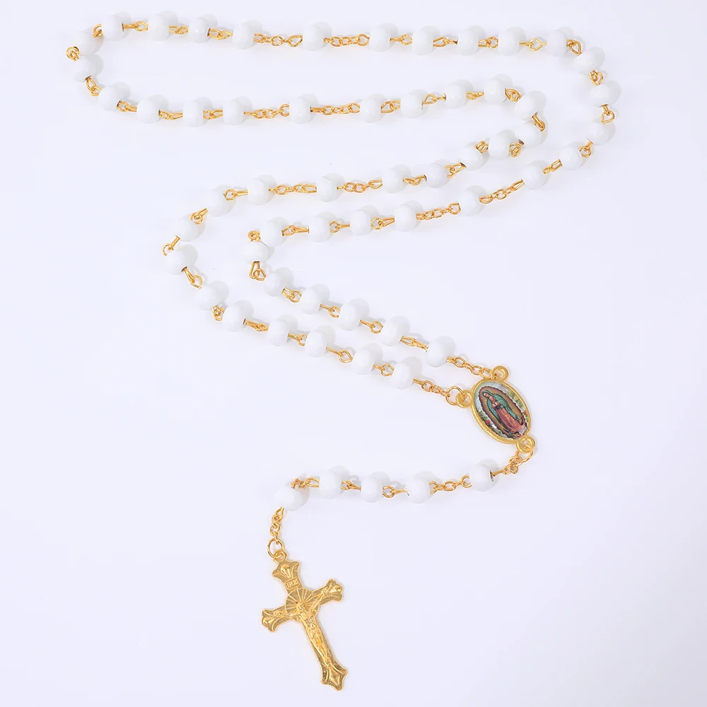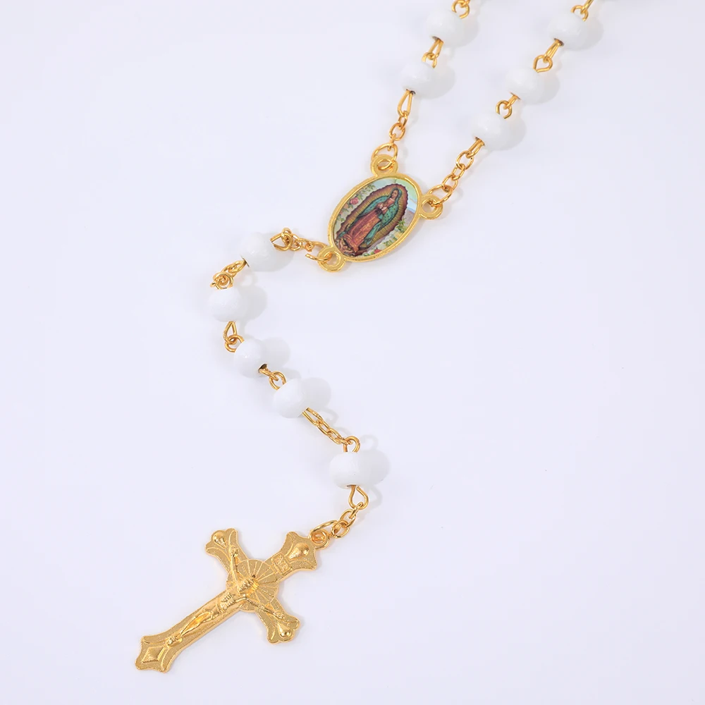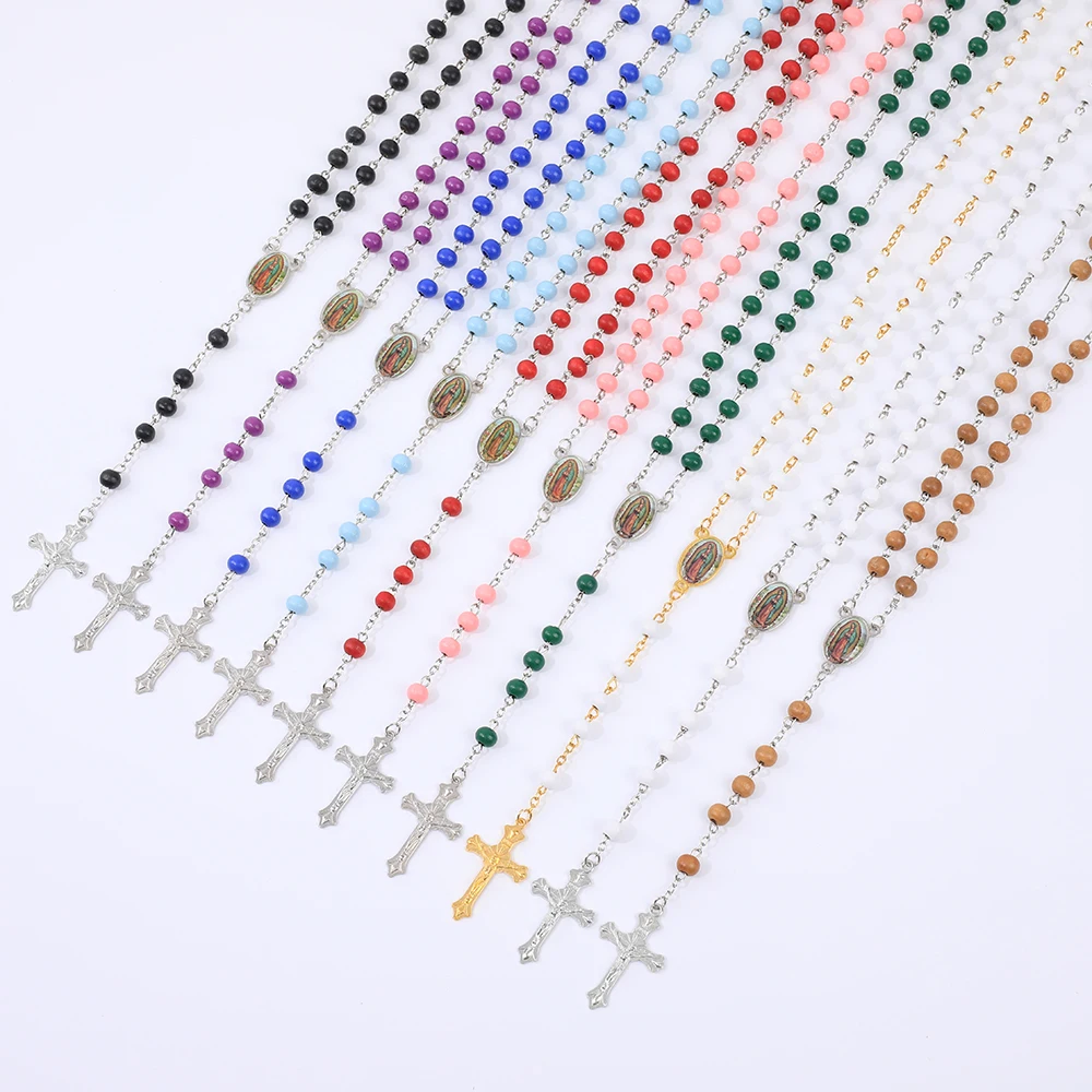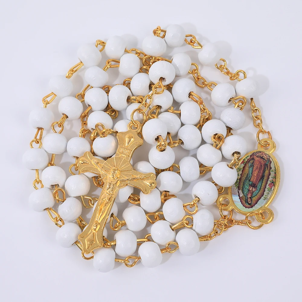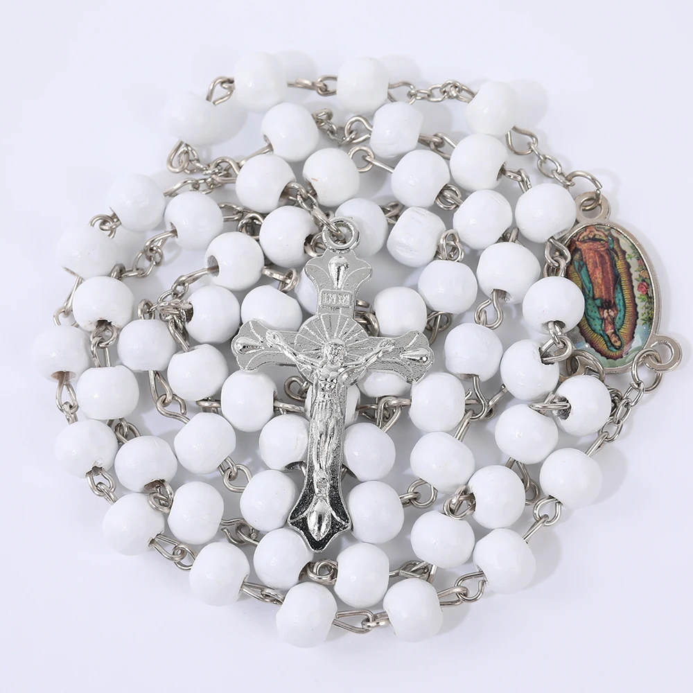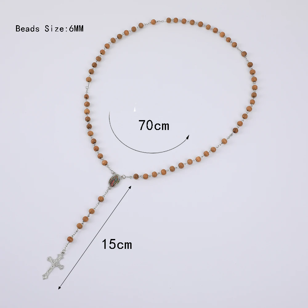 Collier de Perles de Prière en Bois pour Femme, Pendentif Croix de la Vierge Marie, Bijoux Chapelet de ixCatholique, Long JOMen, 6mm