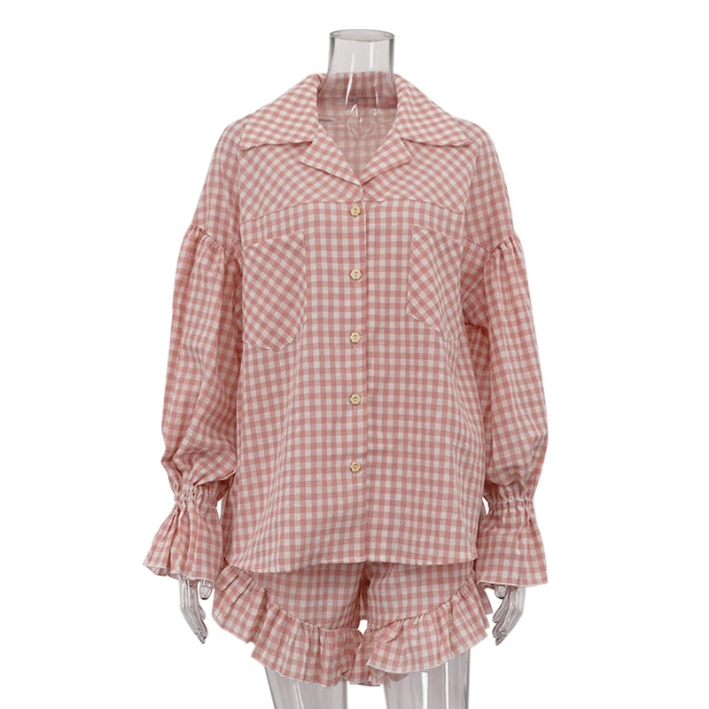 Costume ample à carreaux pour femmes, ensemble tendance, chemise à manches longues et short à volants taille haute, ensemble assorti 2 pièces, 2025 |