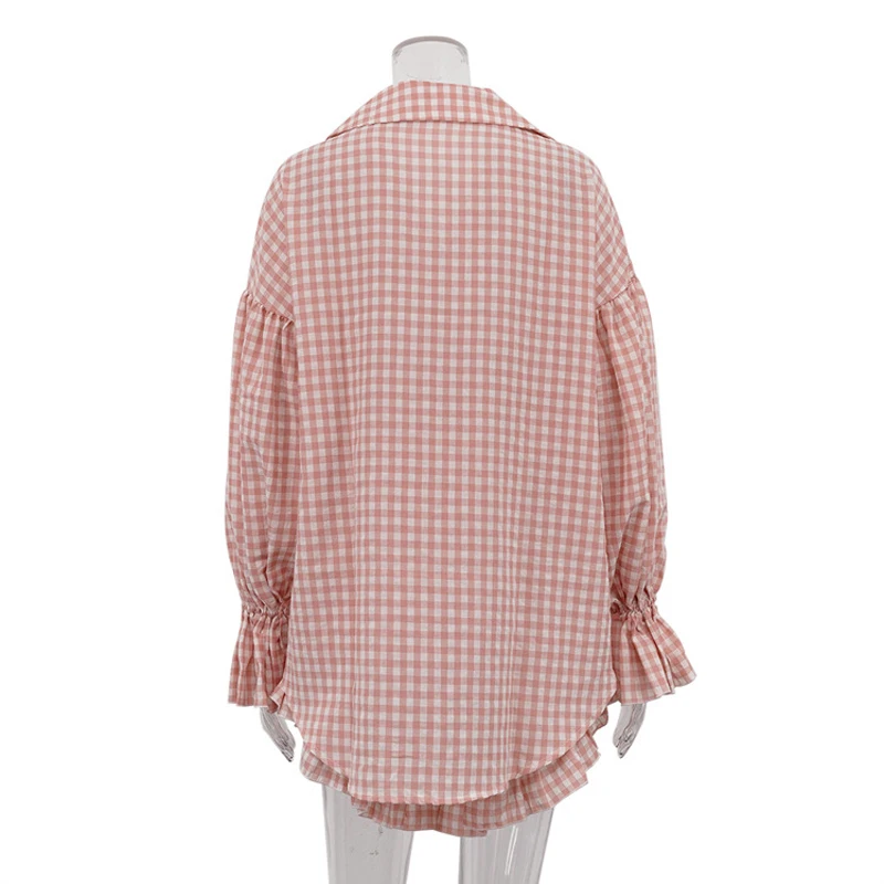 Costume ample à carreaux pour femmes, ensemble tendance, chemise à manches longues et short à volants taille haute, ensemble assorti 2 pièces, 2025
