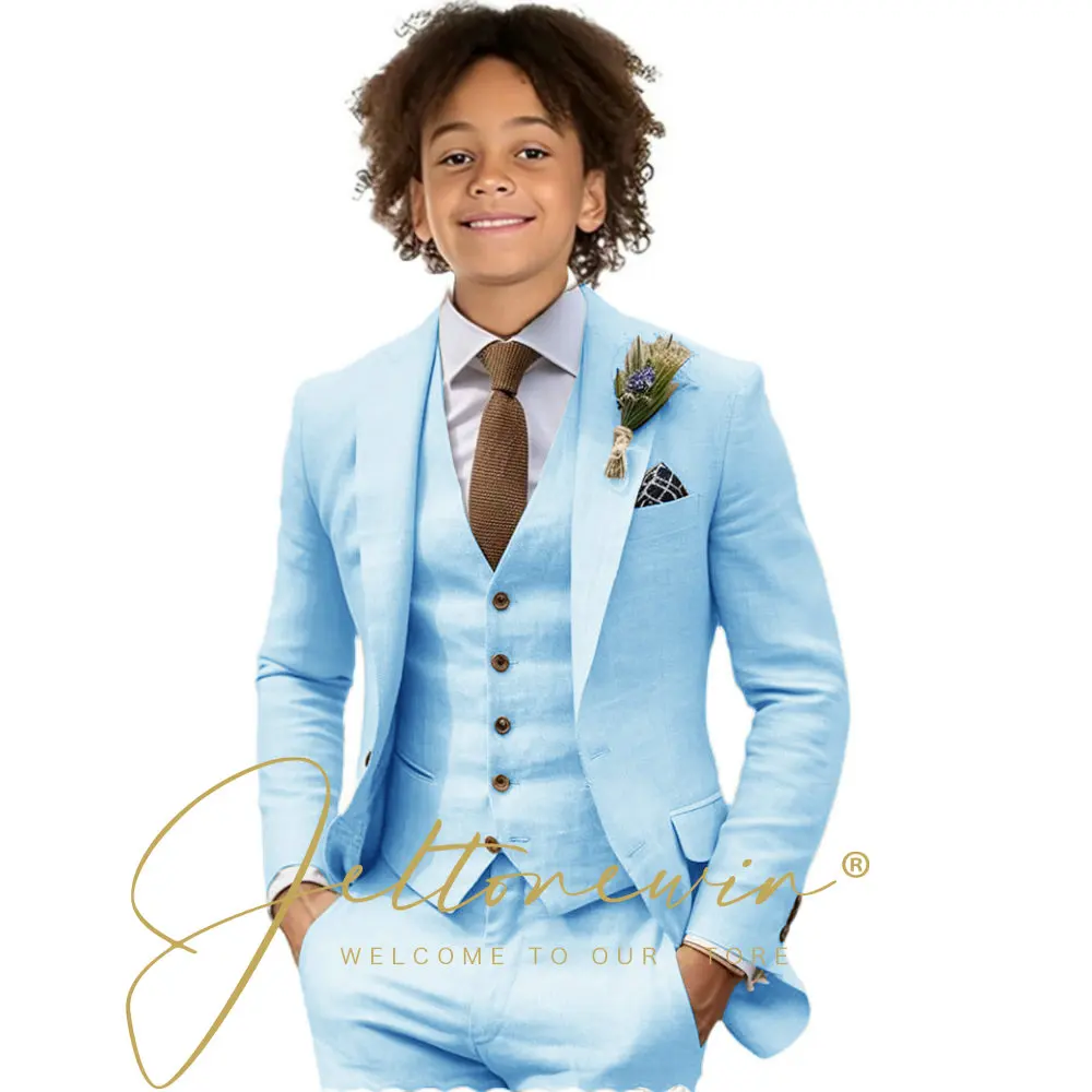 Costumes décontractés en lin Beige pour garçon, 3 pièces, Blazer, gilet, pantalon, ensemble à revers, costume pour enfants, mariage, été, plage, bal, fête, smoking |