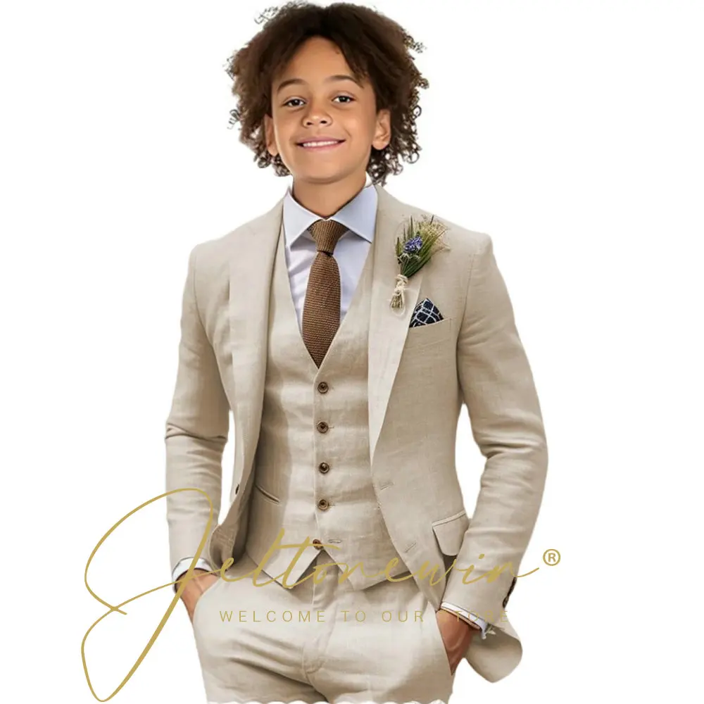 Costumes décontractés en lin Beige pour garçon, 3 pièces, Blazer, gilet, pantalon, ensemble à revers, costume pour enfants, mariage, été, plage, bal, fête, smoking