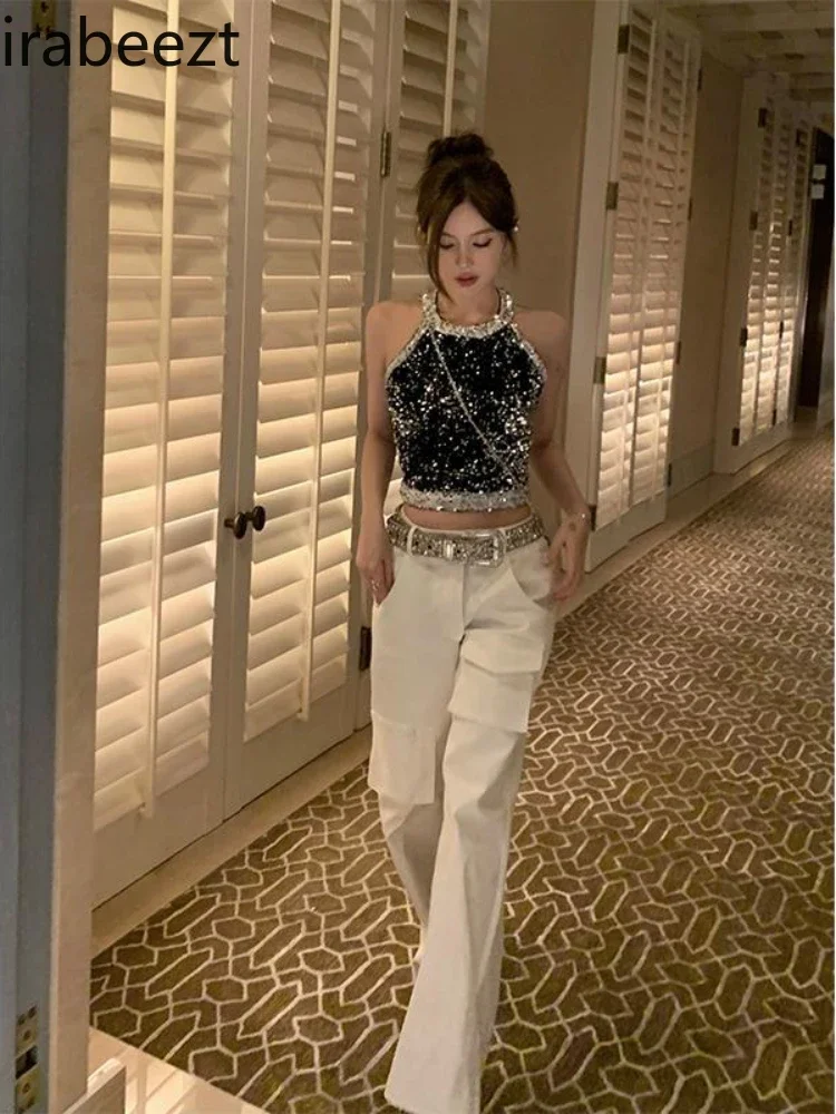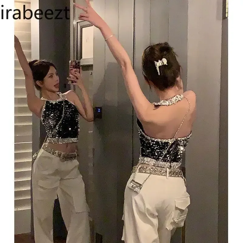 Débardeur à paillettes pour femme, haut court Y2K, vêtements gothiques, Design à la mode, chemises mignonnes, haut sens, col suspendu, col licou