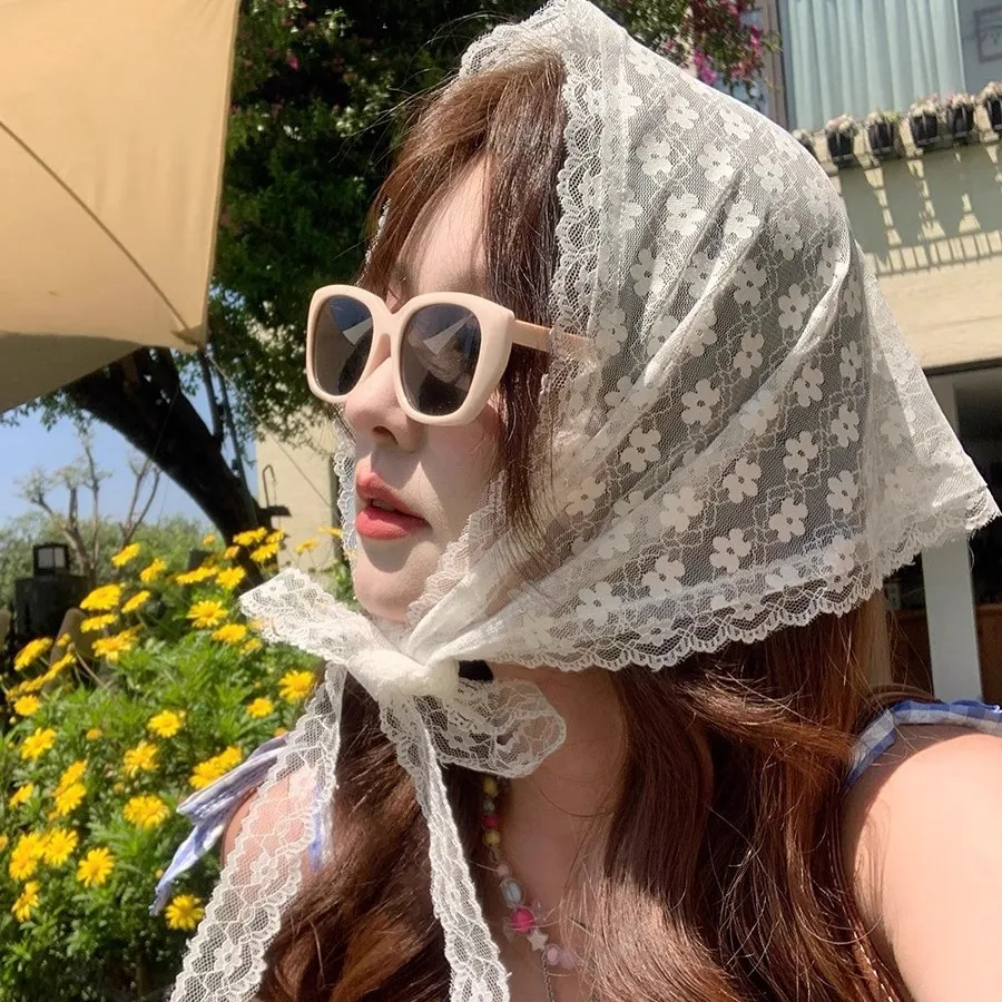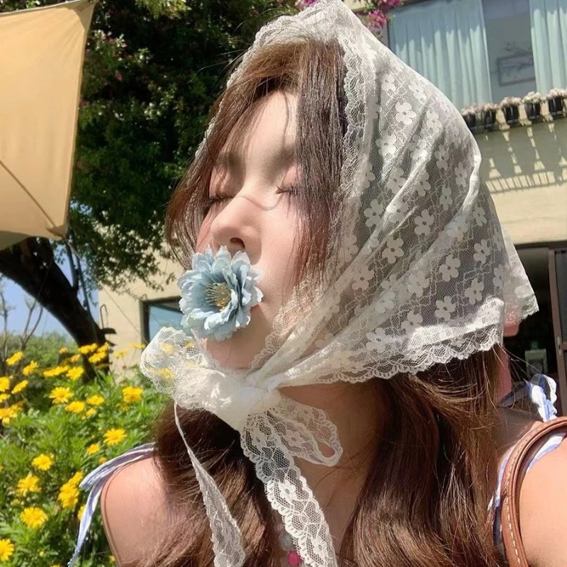 Dentelle fleur tempérament élégant dentelle femme fleur blanc doux Triangle écharpe mince ruban respirant Style artistique Photo de voyage