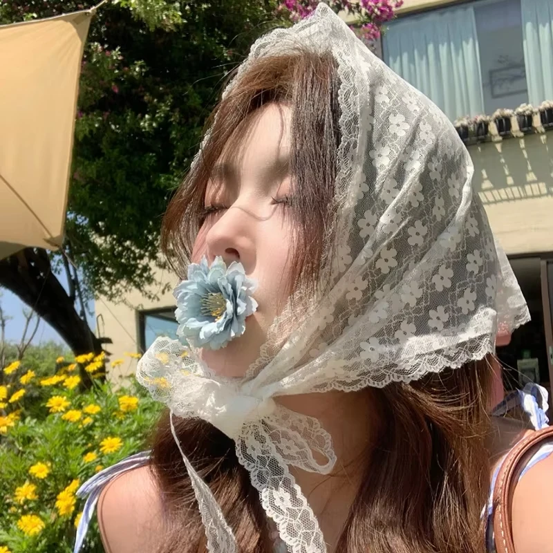 Dentelle fleur tempérament élégant dentelle femmes fleur blanc doux Triangle écharpe mince ruban respirant Style artistique Photo de voyage