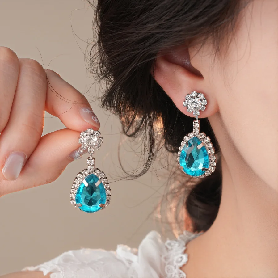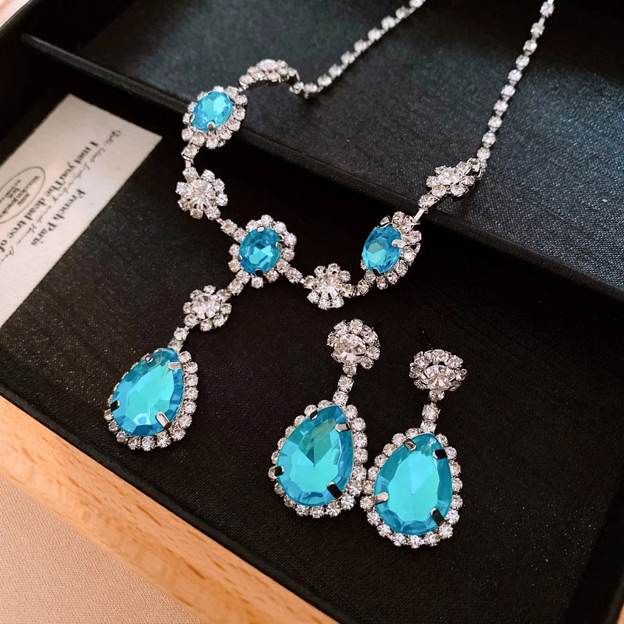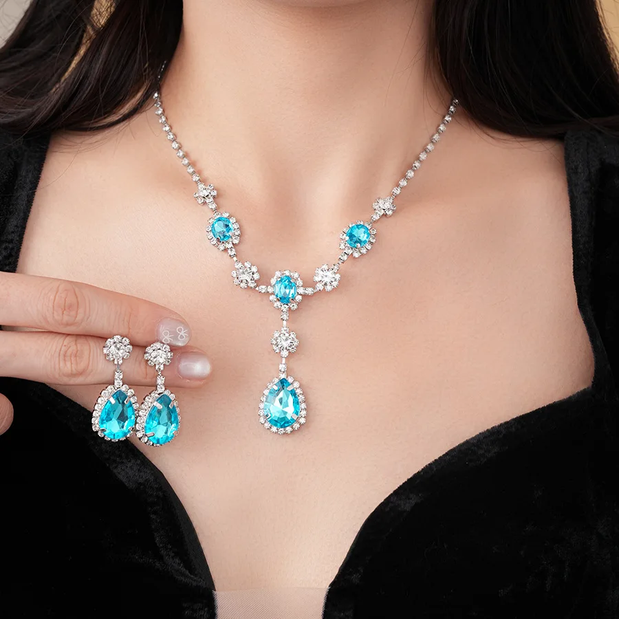 DREJEW diamant incrusté bleu goutte d'eau ensemble de bijoux pour les femmes léger luxe haut de gamme tempérament boucles d'oreilles de mariage collier ensembles |