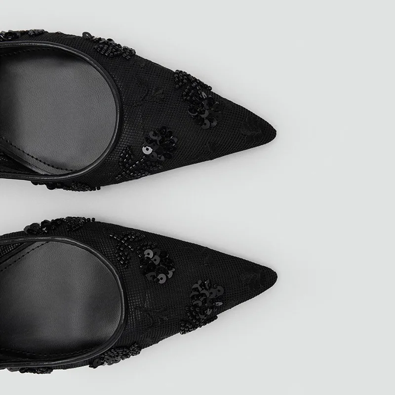 Élégant maille broder sandales à talons bas femmes été marque chaîne perle bout pointu talons Mules mode mariage robe de mariée chaussure |