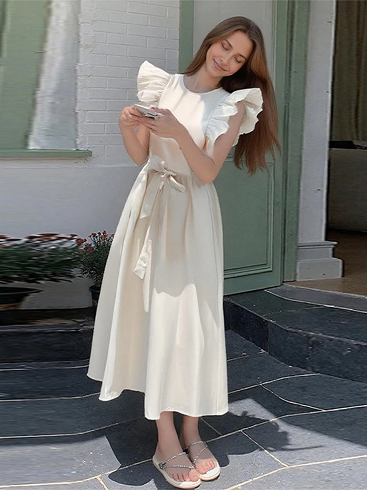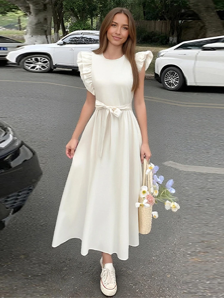 Élégant solide ceinture mouche manches longue robe femmes mode col rond plissé taille haute a-ligne Robes dame été Chic Robes décontractées