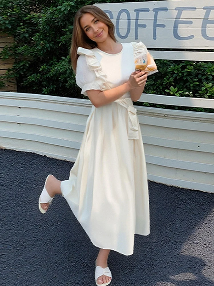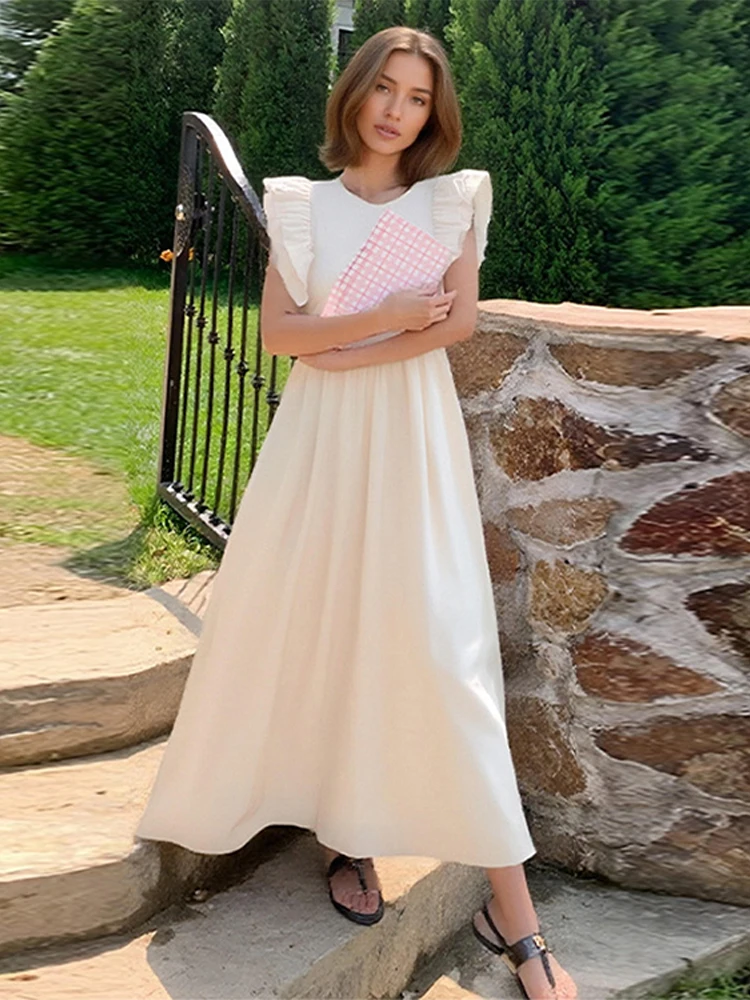 Élégant solide ceinture mouche manches longue robe femmes mode col rond plissé taille haute a-ligne Robes dame été Chic Robes décontractées |