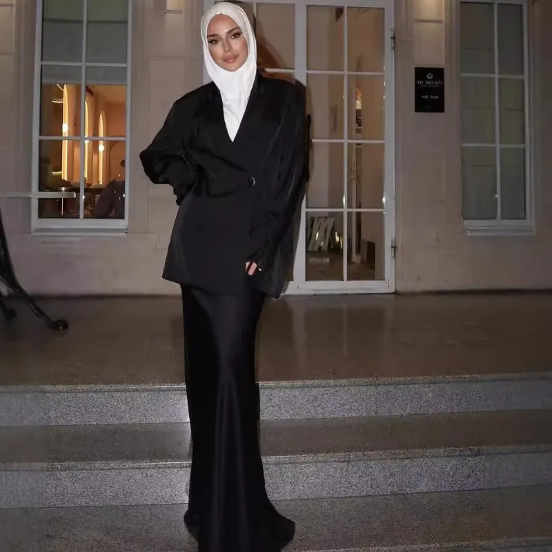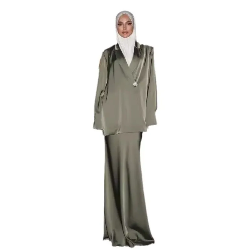 Ensemble 2 pièces en Satin pour femmes musulmanes, élégant, solide, Blazer, col, manteau, jupes longues, ensemble assorti, nouveau Streetwear populaire, printemps 2025 |