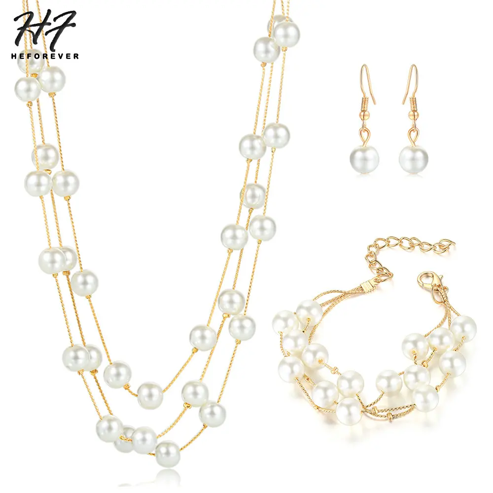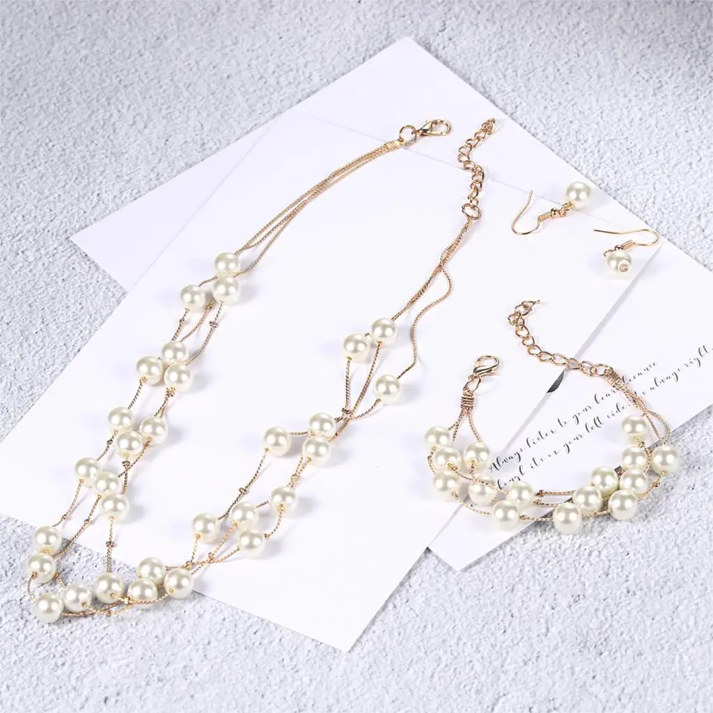 Ensemble de bijoux de mariée pour femme, collier + Bracelet + boucle d'oreille, couleur or/argent, Imitation de perles, à la mode, S441-M |