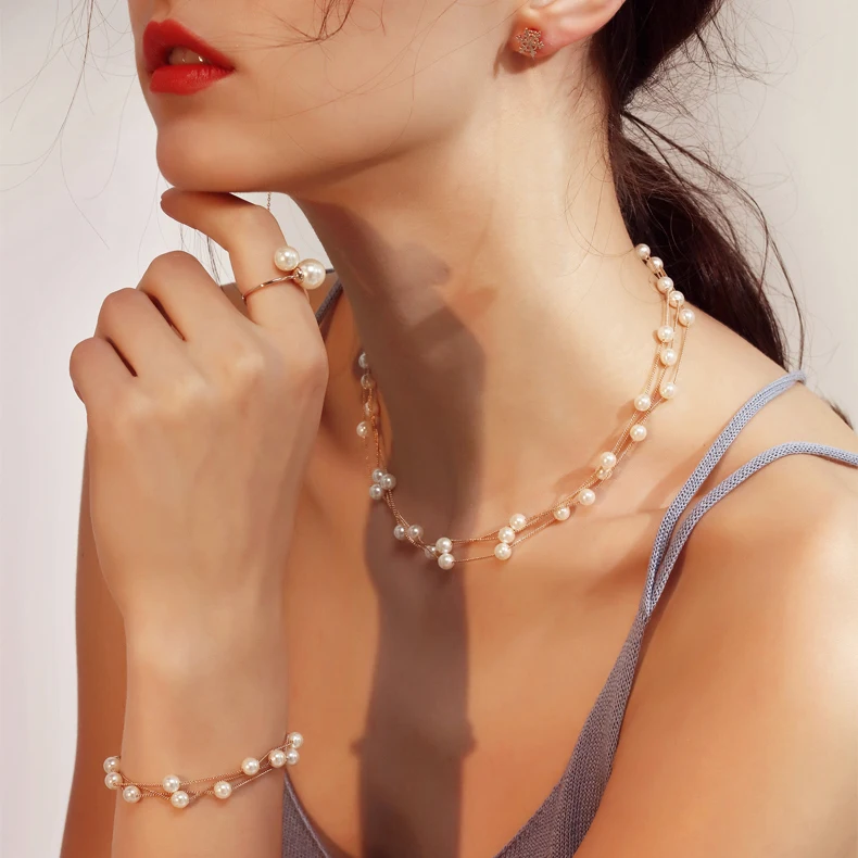 Ensemble de bijoux de mariée pour femme, collier + Bracelet + boucle d’oreille, couleur or/argent, Imitation de perles, à la mode, S441-M