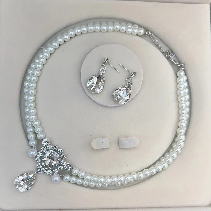 Ensemble de boucles d'oreilles et collier de perles Double pour femmes, ensemble de bijoux Vintage élégant en fausses perles, cadeau de fête et de vacances |