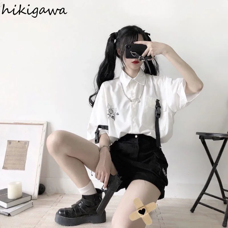 Ensemble deux pièces japonais pour femmes, chemise blanche à manches courtes, salopette à jambes larges, Short, costume Roupas Femme, mode été Y2k