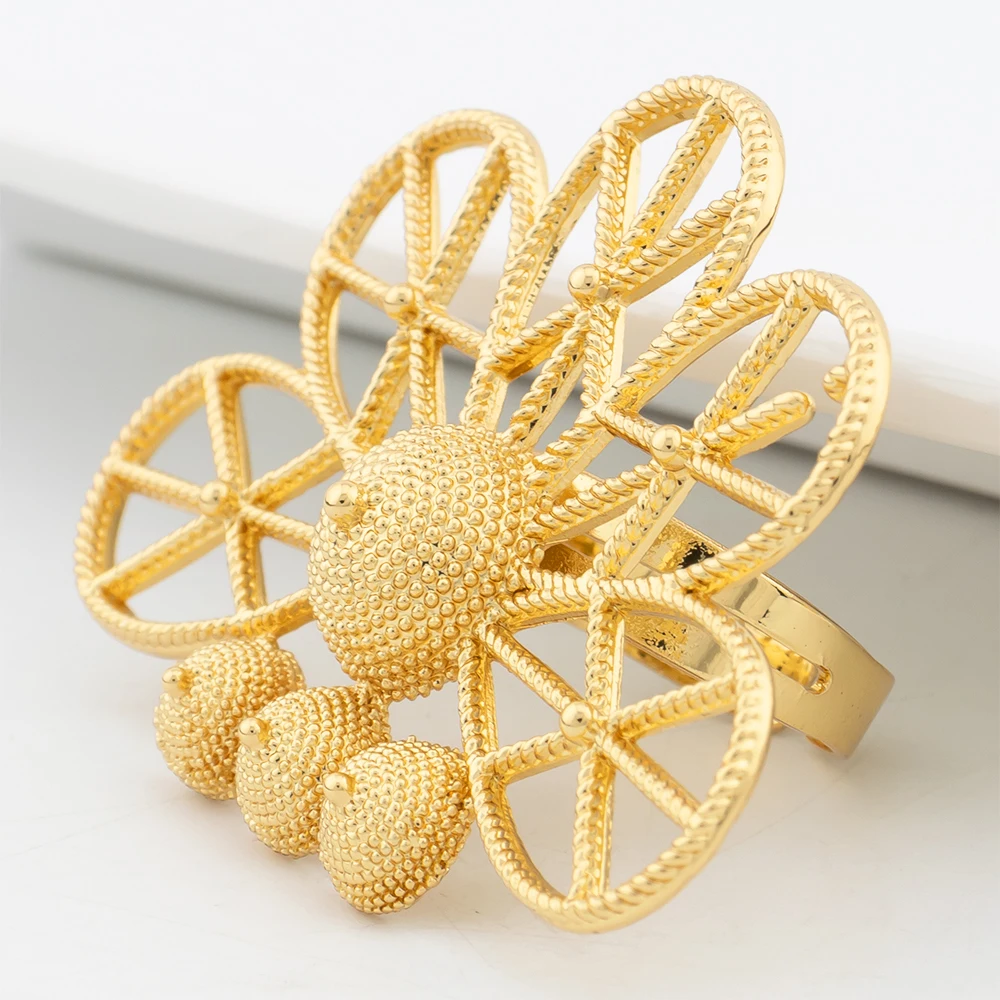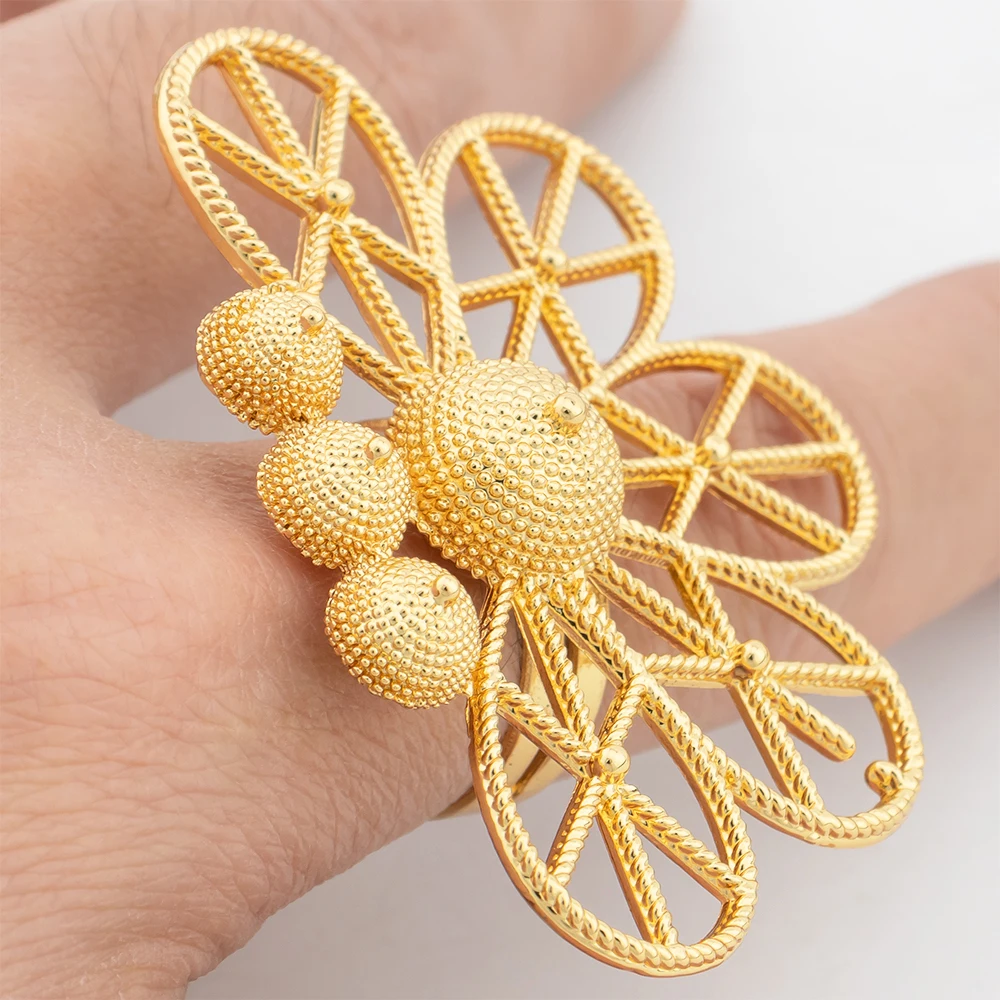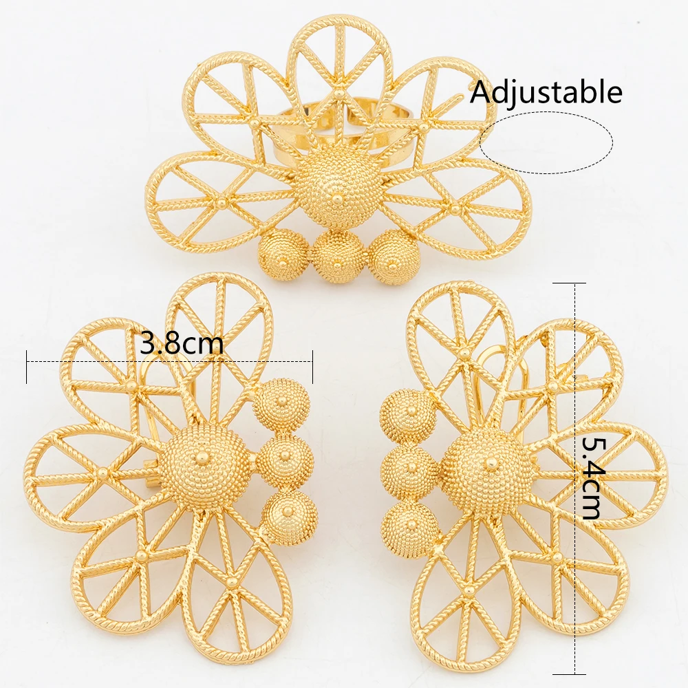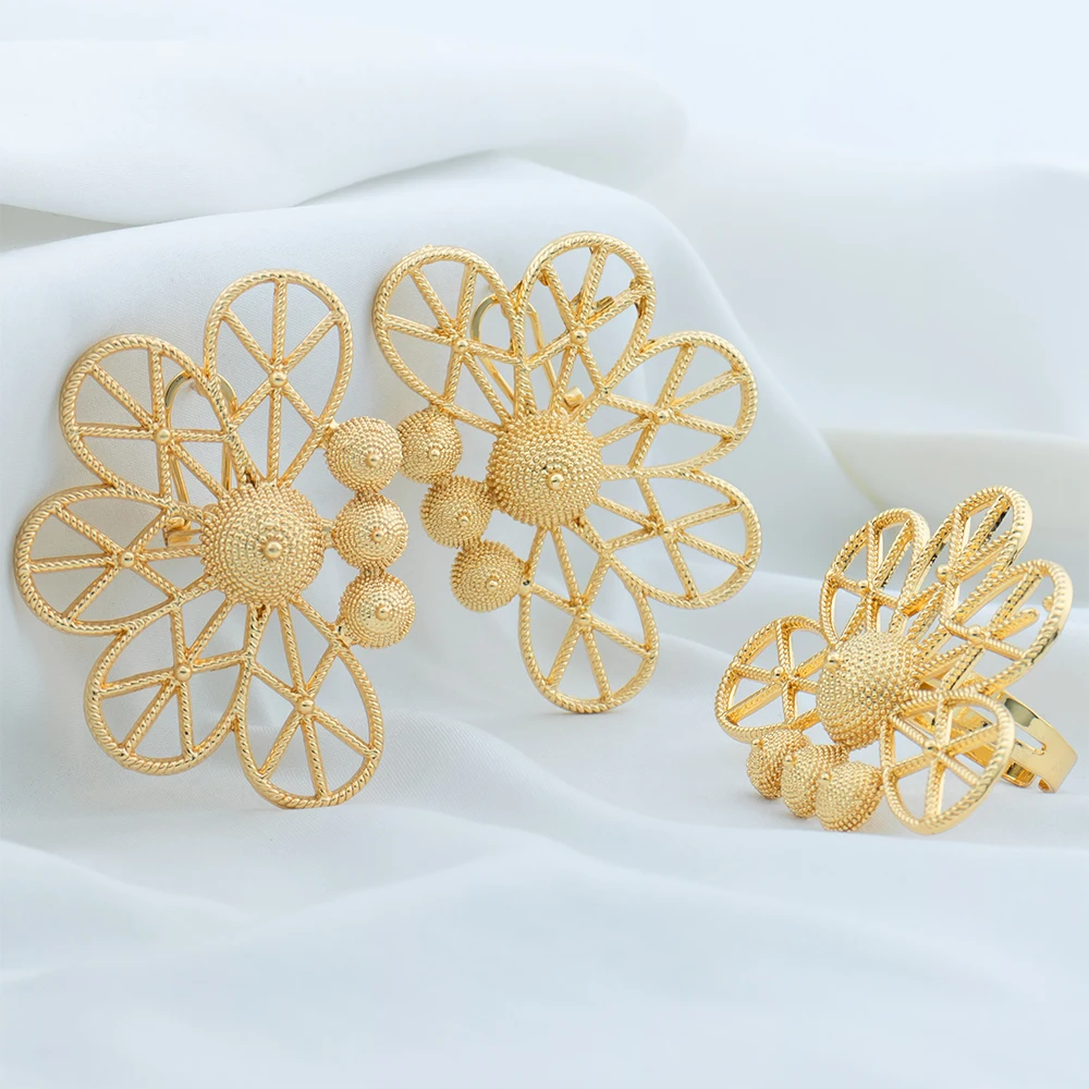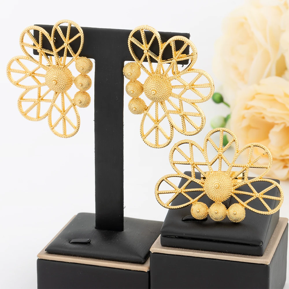 Ensembles de bijoux de dubaï pour femmes, boucles d'oreilles géométriques couleur or, bague ajourée, accessoires de mariage de luxe africains, cadeaux d'anniversaire |