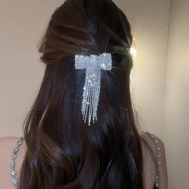 - Accessoire de cheveux élégant et tendance avec son design à franges et nœud en strass