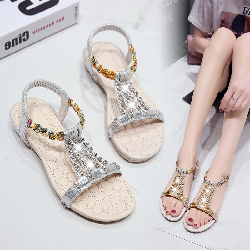 Été nouvelles sandales plates pour femmes 2025 or chaussures orthopédiques sans talon argent mode romaine strass sandale Chic Point chaud |