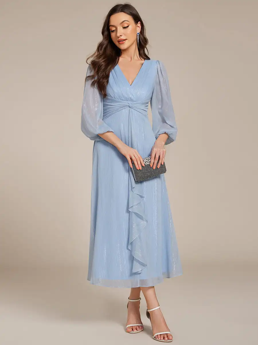 EVER PRETTY-robe de soirée bleu ciel, tenue de soirée élégante, col en V profond, manches longues, longueur genou, mousseline brillante, robes d’Bélées de mariage, 2025