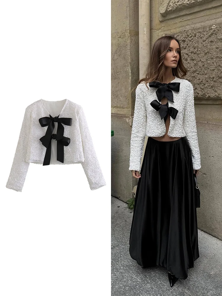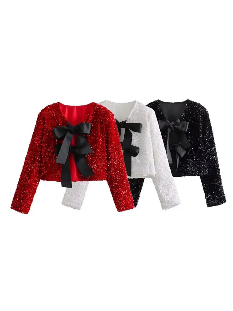 Femme Mode Design paillettes Veste High Street Tempérament Nœud papillon court Veste à manches longues Nouveau Tops femme élégants |