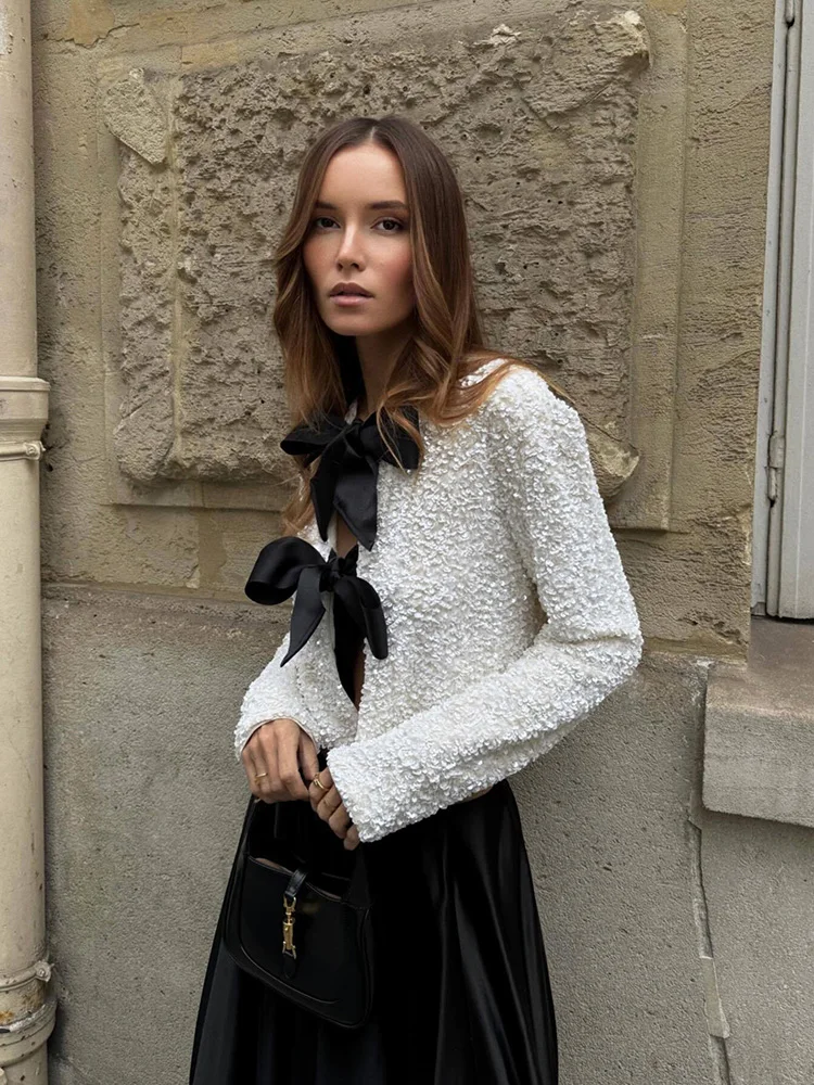 Femme Mode Design paillettes Veste High Street Tempérament Nœud papillon court Veste à manches longues Nouveau Tops femme élégants