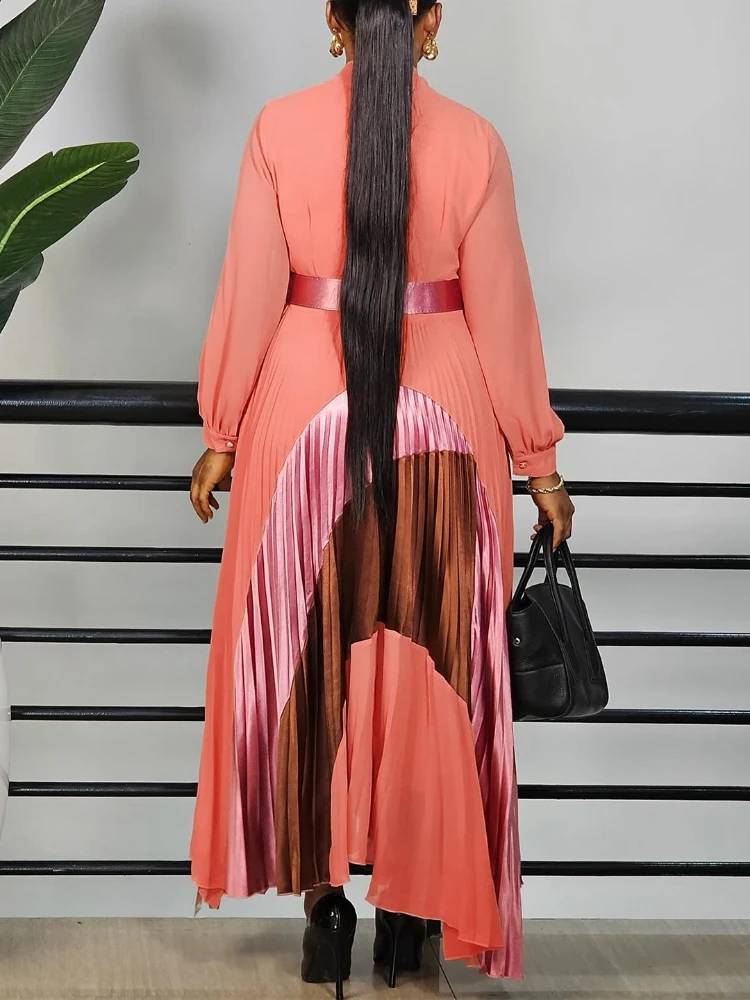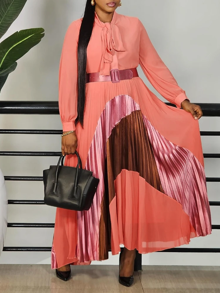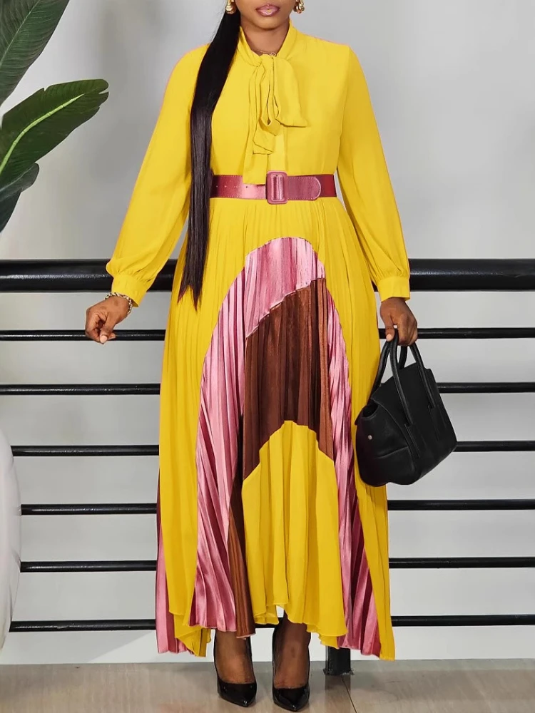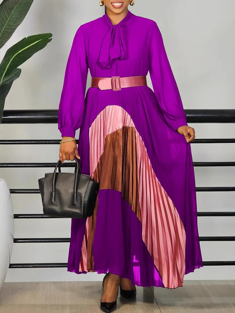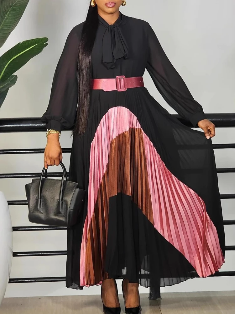 Femmes élégantes à manches longues Patchwork Maxi robe plissée avec ceinture nœud manches bouffantes vêtements africains dubaï caftan Abaya tenue de fête