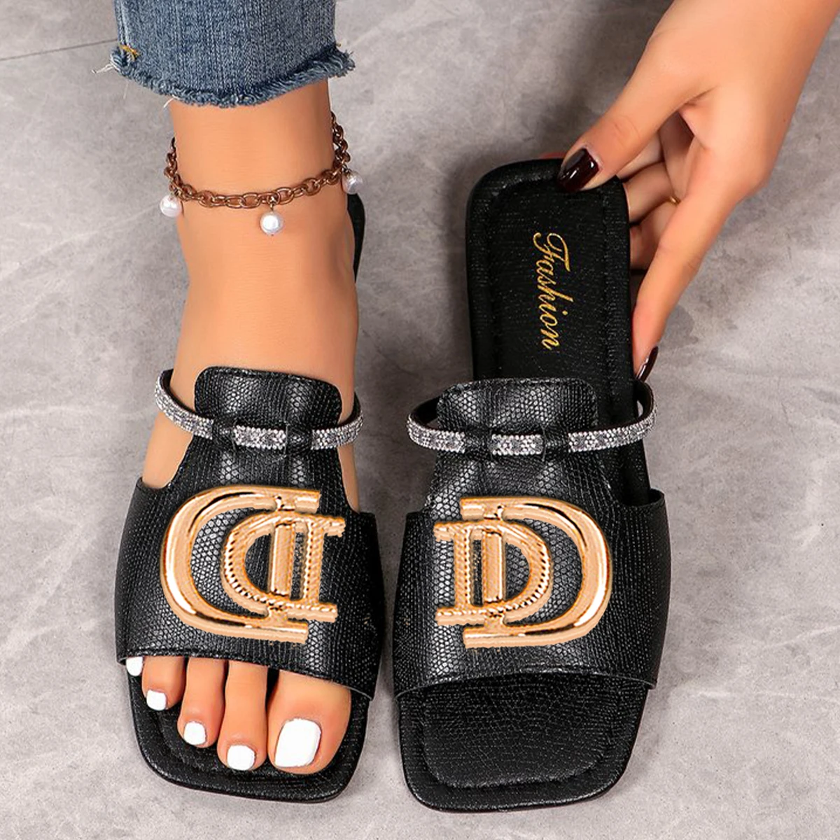 Femmes luxe décor glisser sandales Beige noir été printemps automne en plein air mode élégant Sexy décontracté semelles plates bureau Mujer |