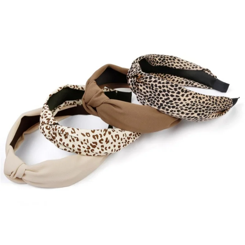 Femmes populaires imprimé léopard Satin tissu noeud bandeau dame filles Simple solide sergé tissu noué bandeau décontracté tête cerceau |