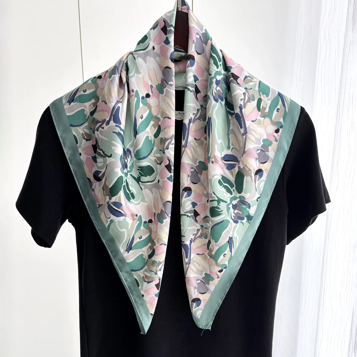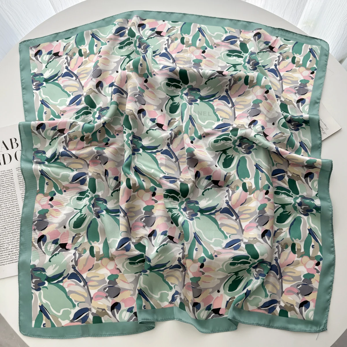 Foulard carré de luxe en soie 70cm pour femmes, Bandanas, bandeau élégant pour dames, imprimé Floral vert, foulard, ruban de sac Hijab