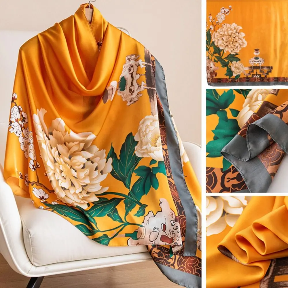 Foulard coréen luxe foulard en soie élégant motif Lotus en mousseline de soie châle enveloppement impression doux femmes Hijab châles femme |