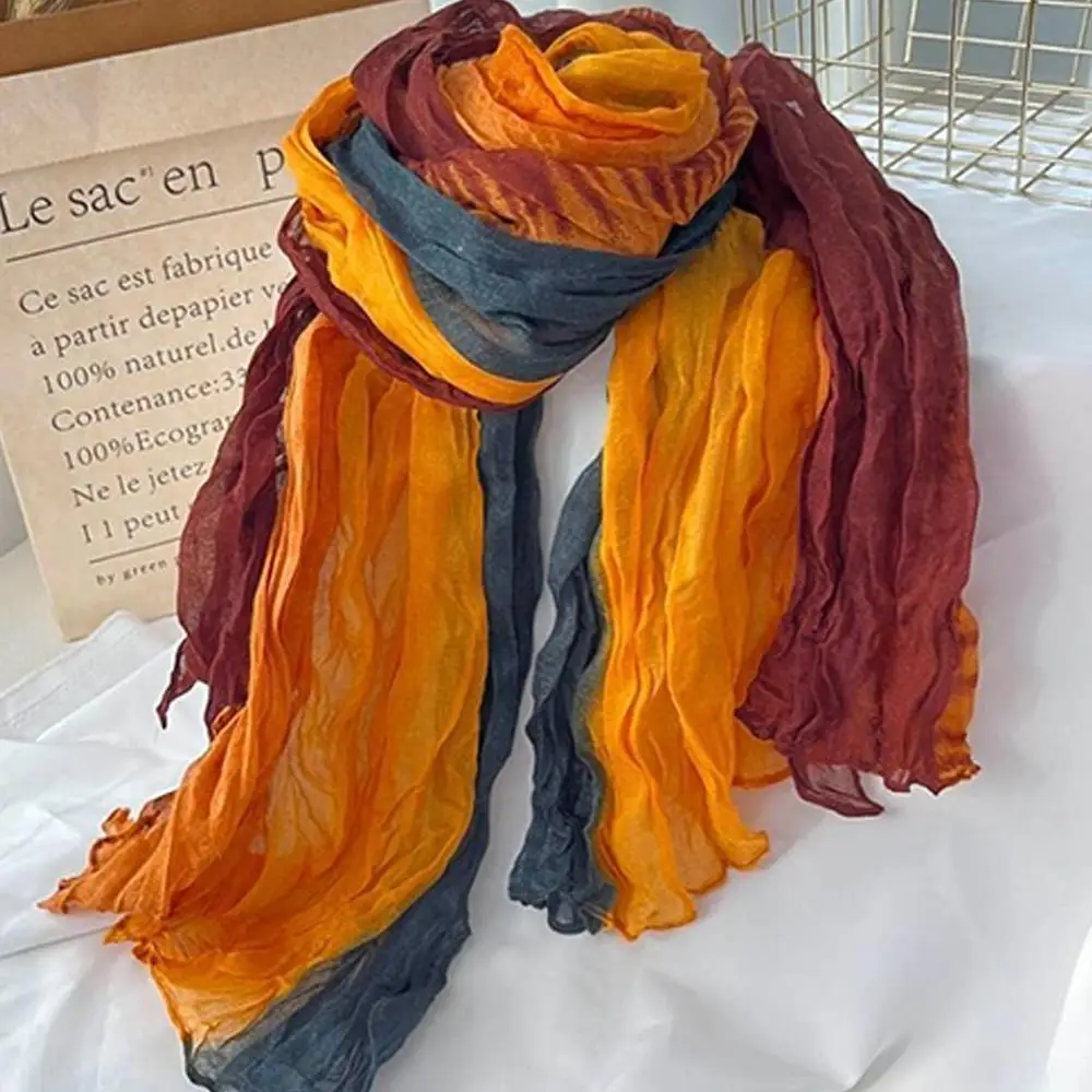 Foulard en lin de coton rétro automne hiver plissé soie longs châles musulman froissé Hijab foulard dégradé couleur froissé foulards |