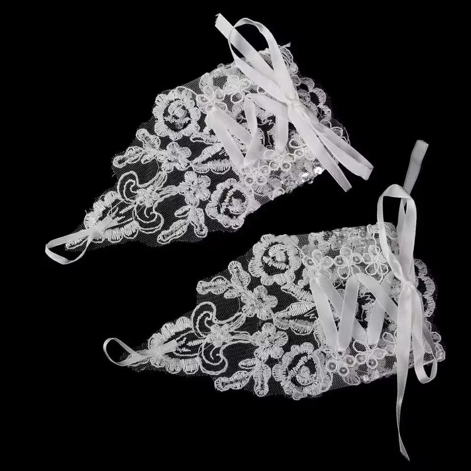 Gants courts en dentelle incrustés de biscuits avec nœud papillon pour patients, élégants, minces, sans doigts, blanc, ivoire, accessoires de robe de mariée