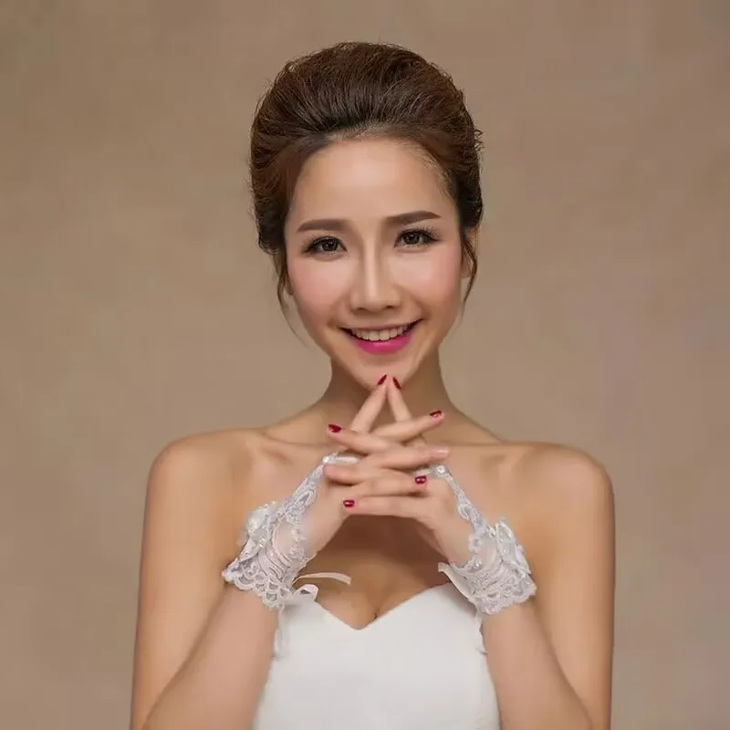 Gants courts en dentelle incrustés de biscuits avec nœud papillon pour patients, élégants, minces, sans doigts, blanc, ivoire, accessoires de robe de mariée |