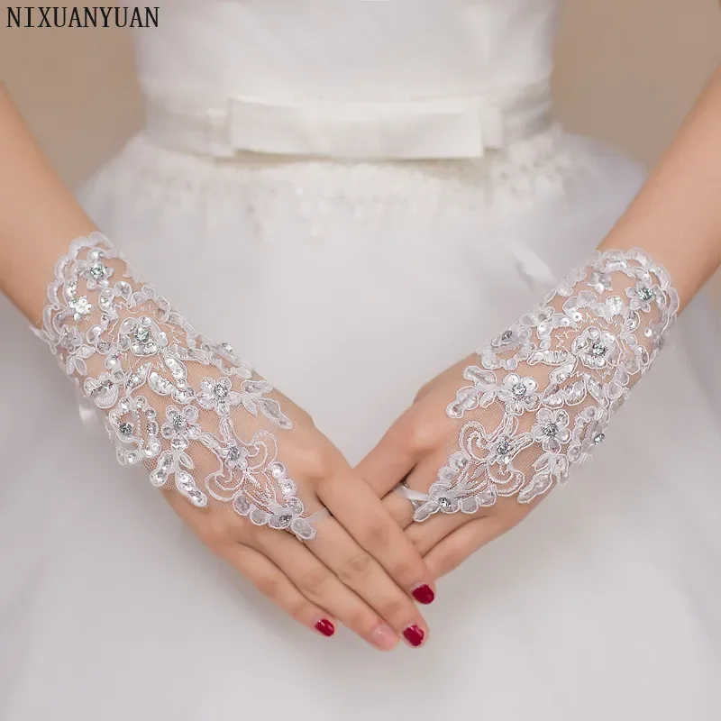 Gants De mariée courts en Satin et dentelle perlée, élégants, sans doigts, blanc ivoire, accessoires De mariage, Veu De Noiva, 2025 |