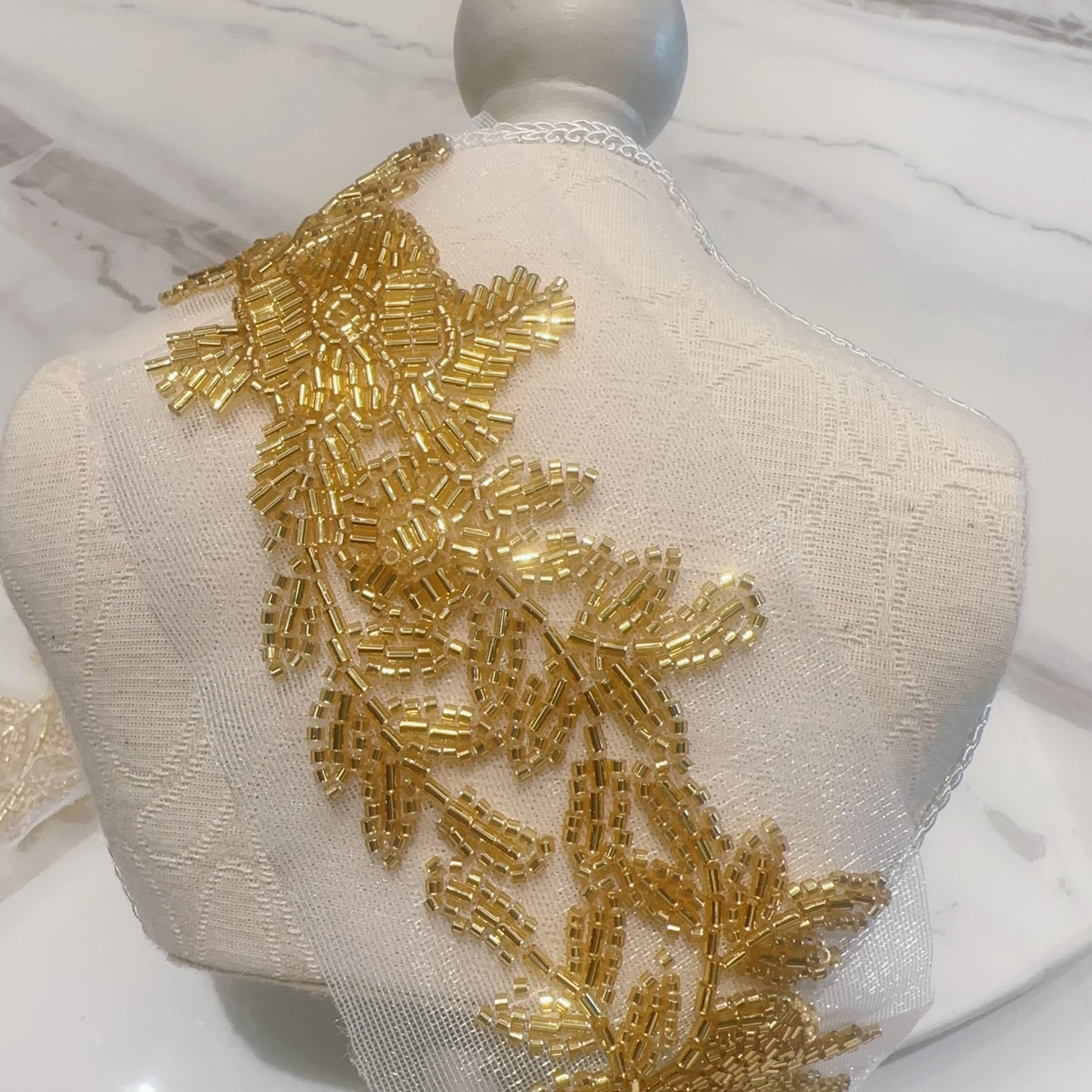 - Élégance et raffinement avec ses perles et sa dentelle dorée