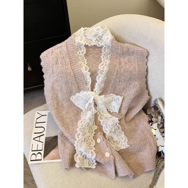 Gilet avec nœud en dentelle pour femme, pull superposé extérieur, nouvelle collection automne 2025