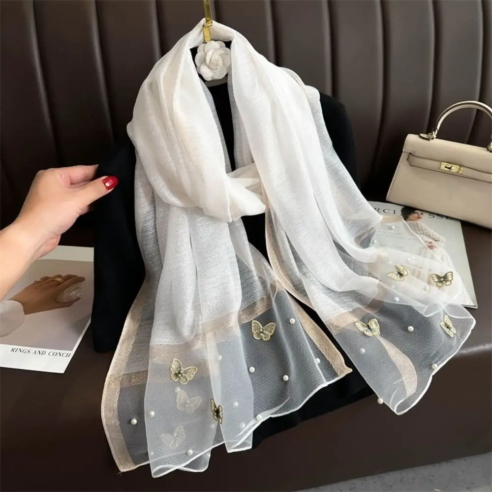 Grand Foulard Fin et Élégant avec Broderie Papillon, Châle Hijab de Luxe pour Femme