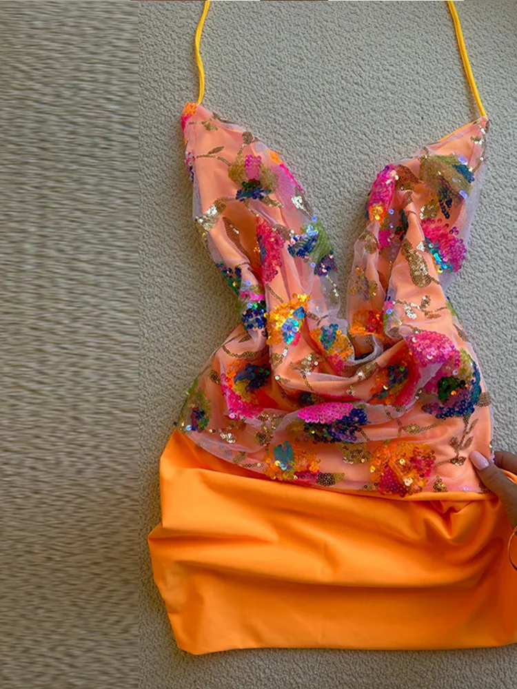 Haut à paillettes dégradé pour femmes, col en v profond, dos nu, sans manches, col licou, été, plage, Sexy, Chic, mode dame, costume, 2025