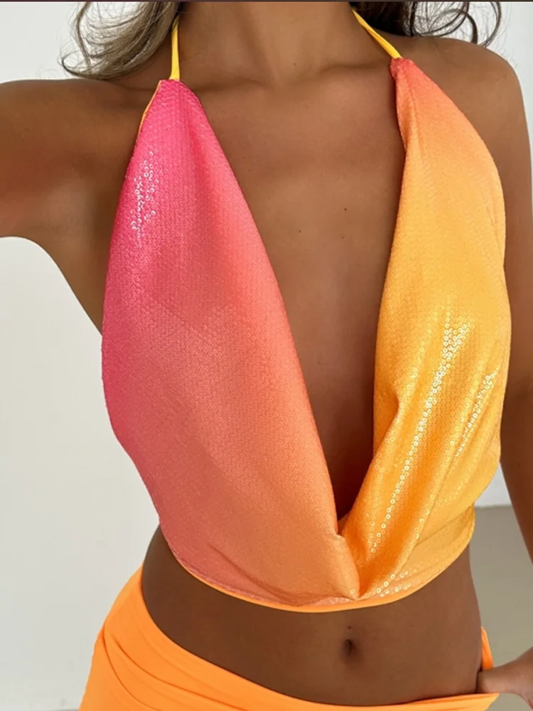 Haut à paillettes dégradé pour femmes, col en v profond, dos nu, sans manches, col licou, été, plage, Sexy, Chic, mode dame, costume, 2025 |