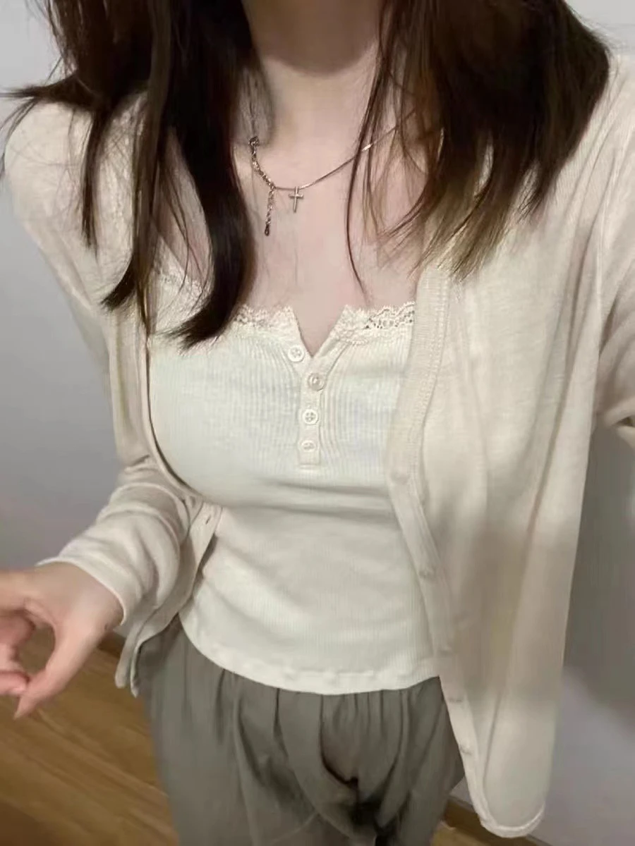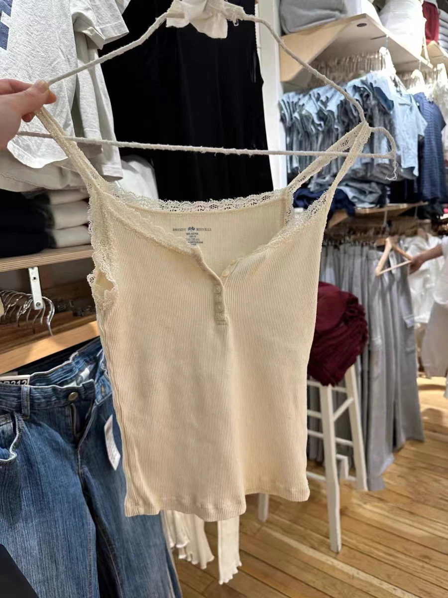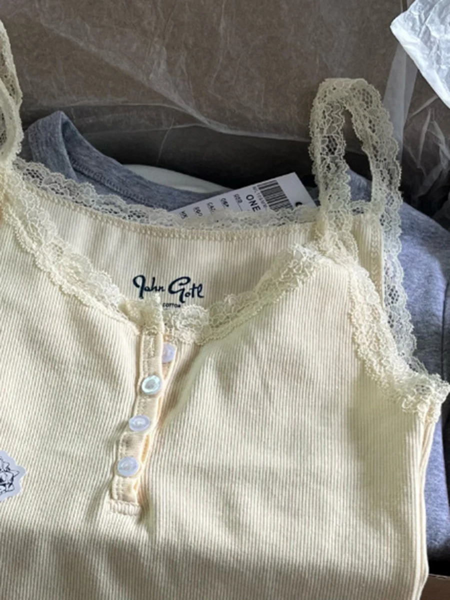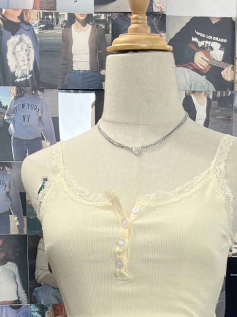 Haut court en dentelle Beige pour femmes, Streetwear, Sexy, sans manches, boutons, gilet en coton, Chic, Slim, Y2k, été, 2023 |