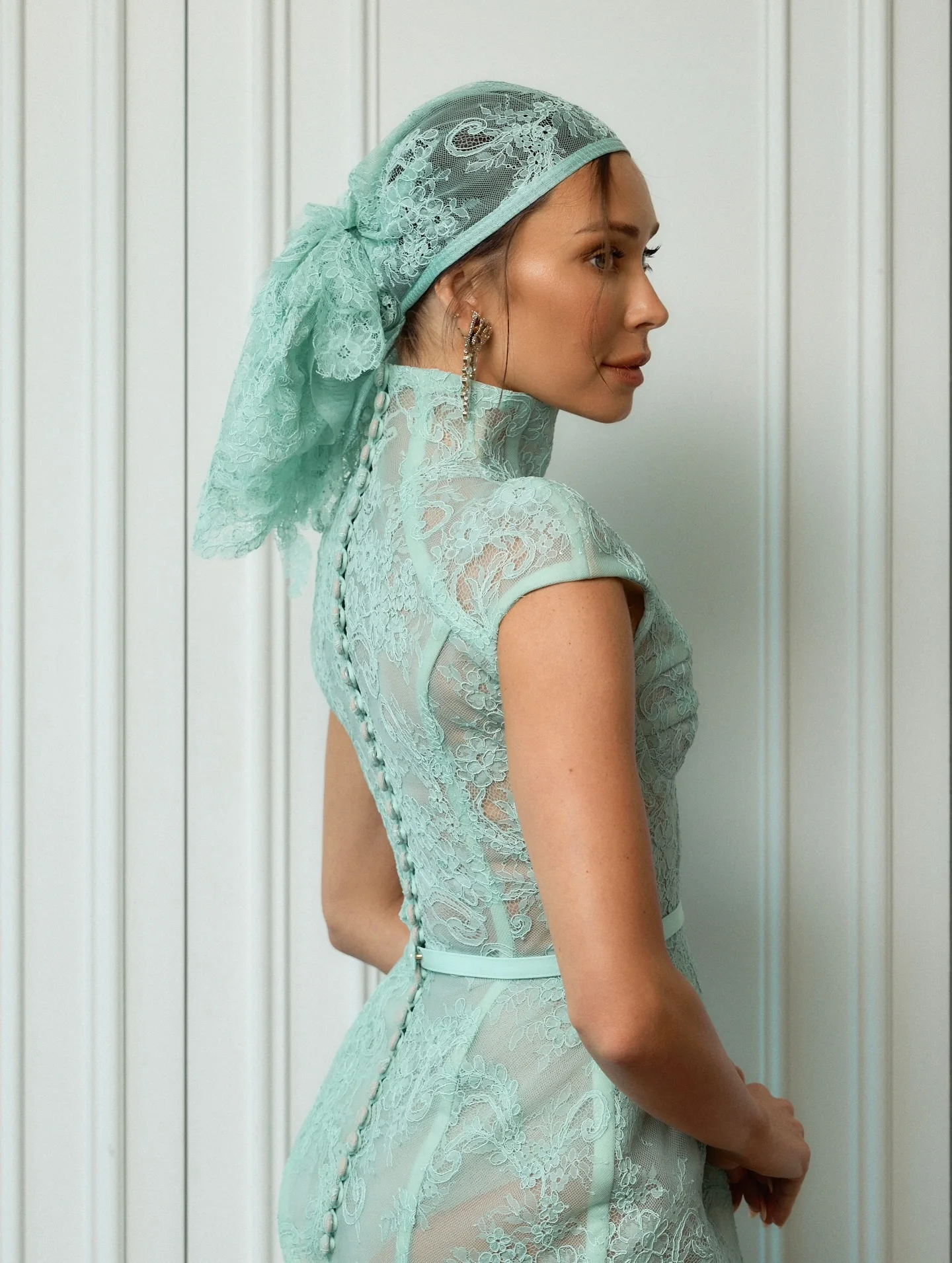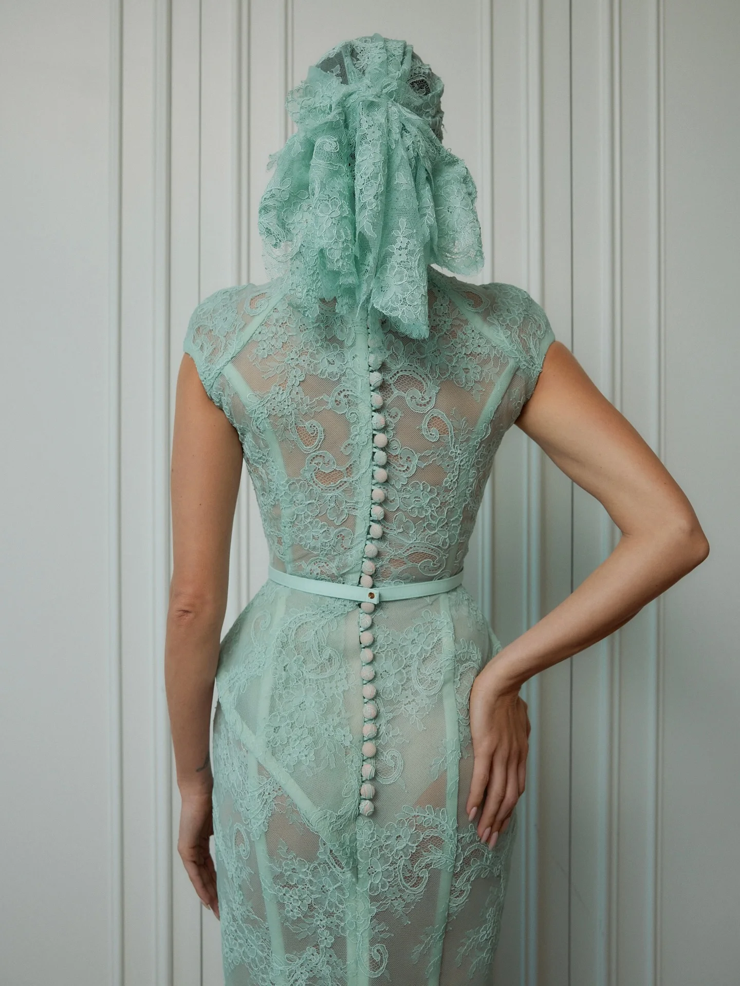 Haute Couture menthe dentelle robes de soirée conception Unique col haut mancherons bal robe mi-longue élégance robes de soirée formelles événement |