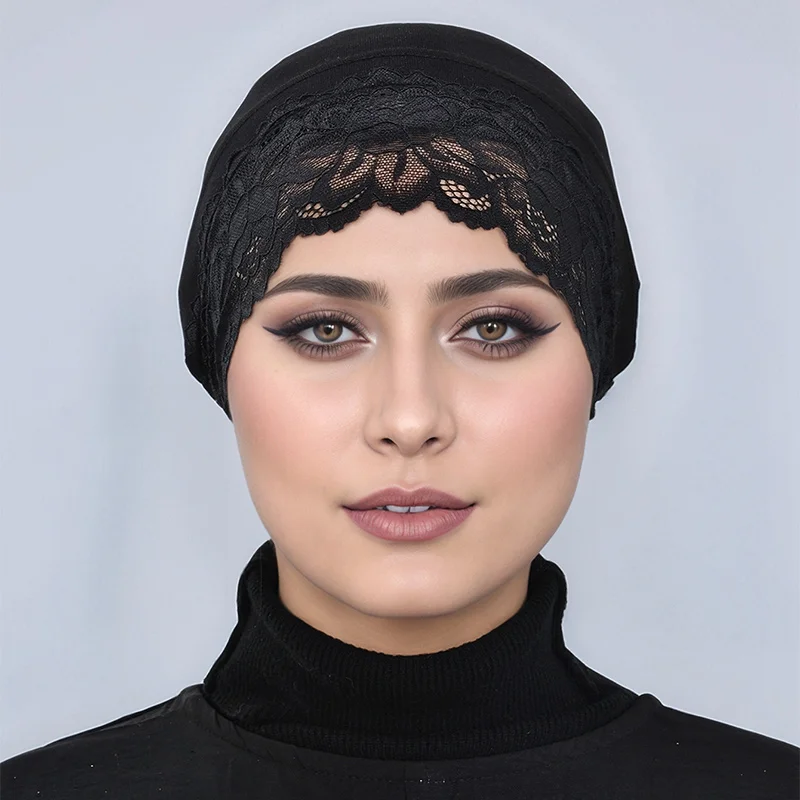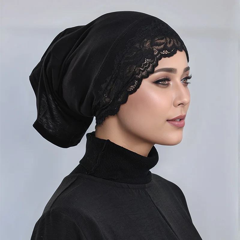 Hijab avec coutures en dentelle pour femmes, casquettes tubulaires, hijab intérieur musulman, monochromatique, document, turban design, sous-casquettes en jersey souple, casquettes ouvertesHijab avec coutures en dentelle pour femmes, casquettes tubulaires, hijab intérieur musulman, monochromatique, document, turban design, sous-casquettes en jersey souple, casquettes ouvertes