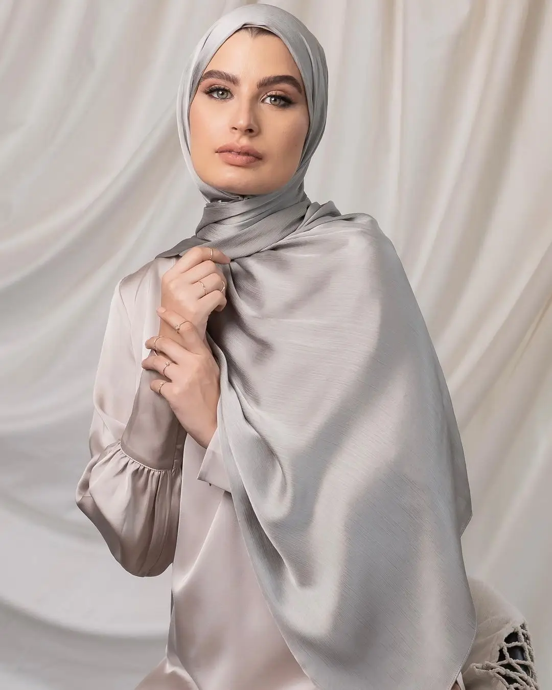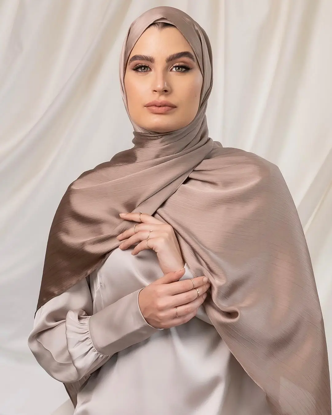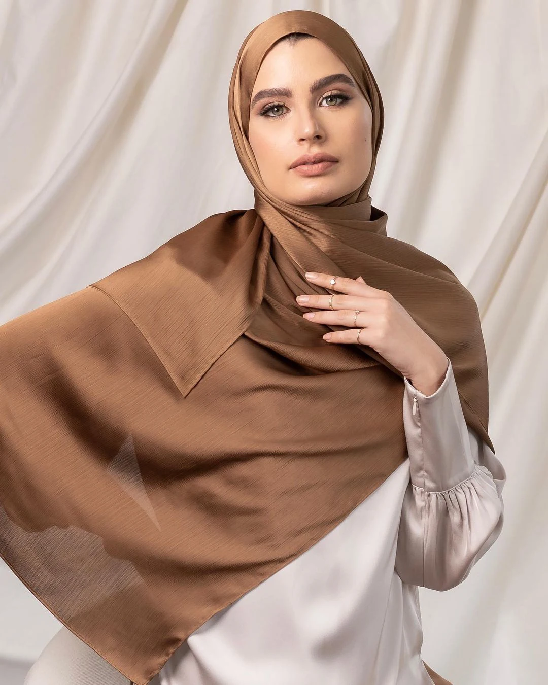 - Hijab froissé en satin offrant un look décontracté et élégant