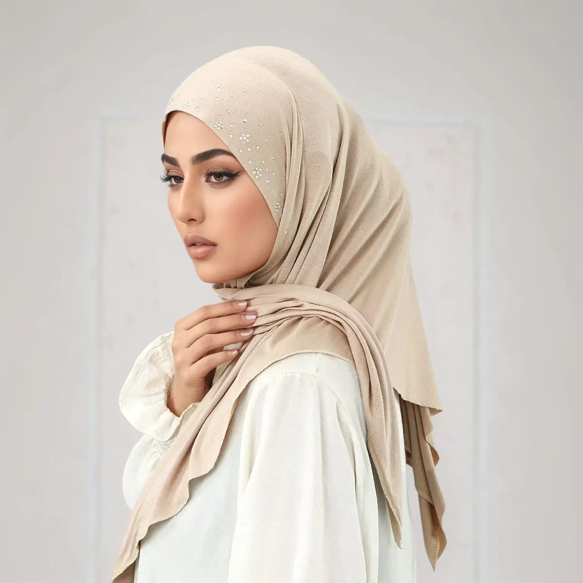 Hijab en jersey de strass scintillants, écharpe musulmane triangulaire Beige, bandeau islamique doux et extensible avec détails éblouissants pour le quotidien