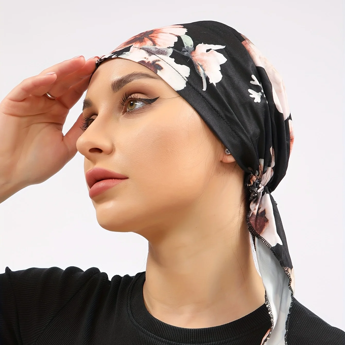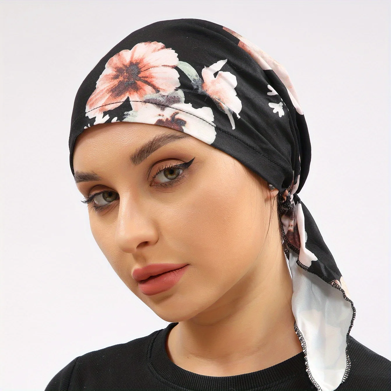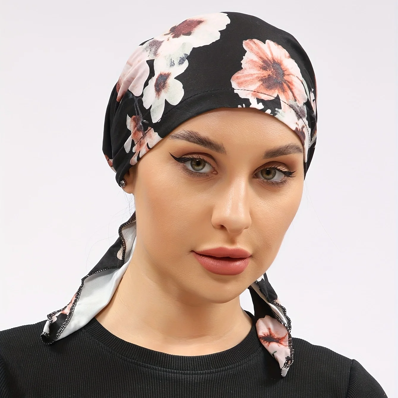 Hijab musulman pour femme, écharpe de tête pour la perte de cheveux, chapeau de chimio, turban à fleurs noires, bandana rond pré-noué, vêtements de saunaHijab musulman pour femme, écharpe de tête pour la perte de cheveux, chapeau de chimio, turban à fleurs noires, bandana rond pré-noué, vêtements de sauna
