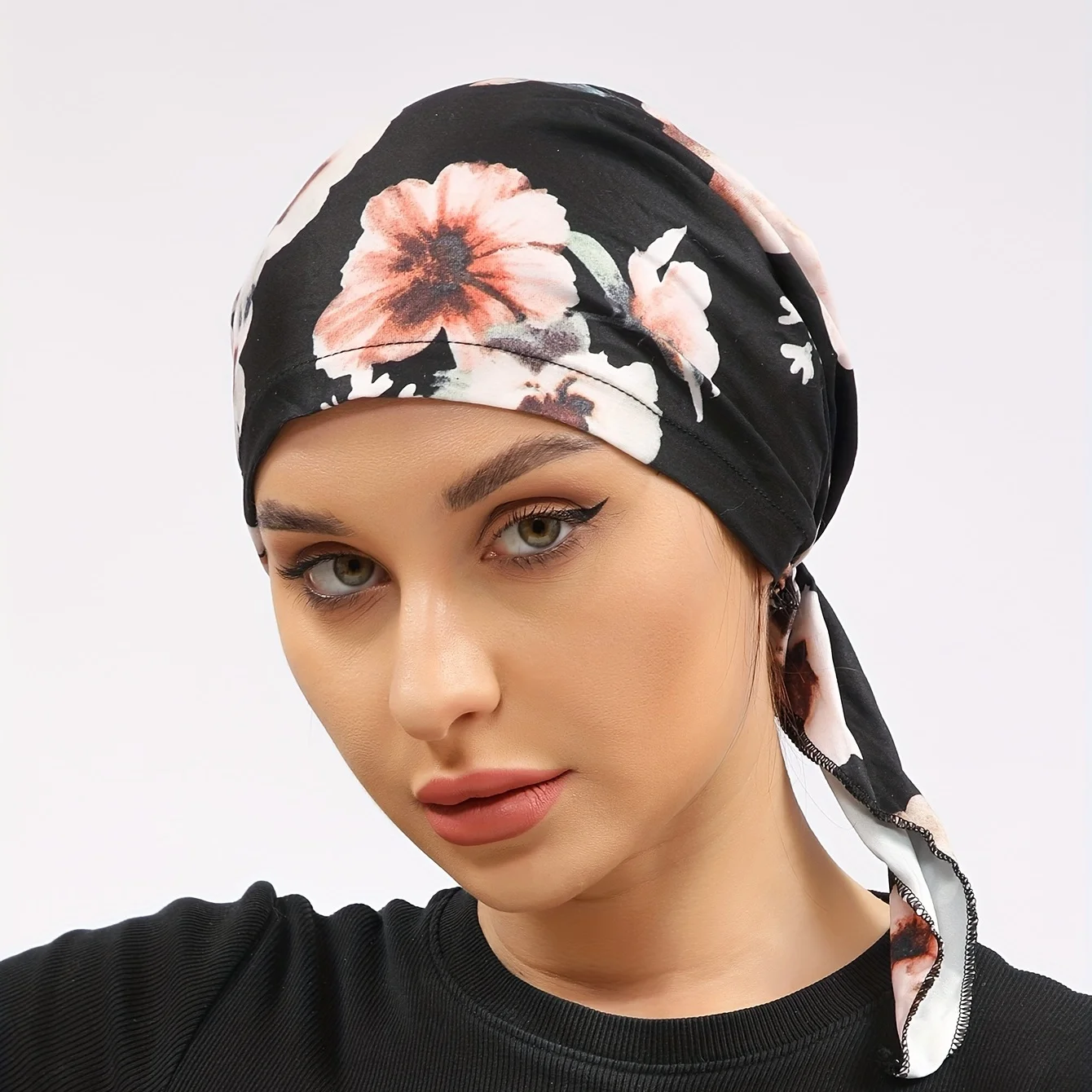 Hijab musulman pour femme, écharpe de tête pour la perte de cheveux, chapeau de chimio, turban à fleurs noires, bandana rond pré-noué, vêtements de sauna