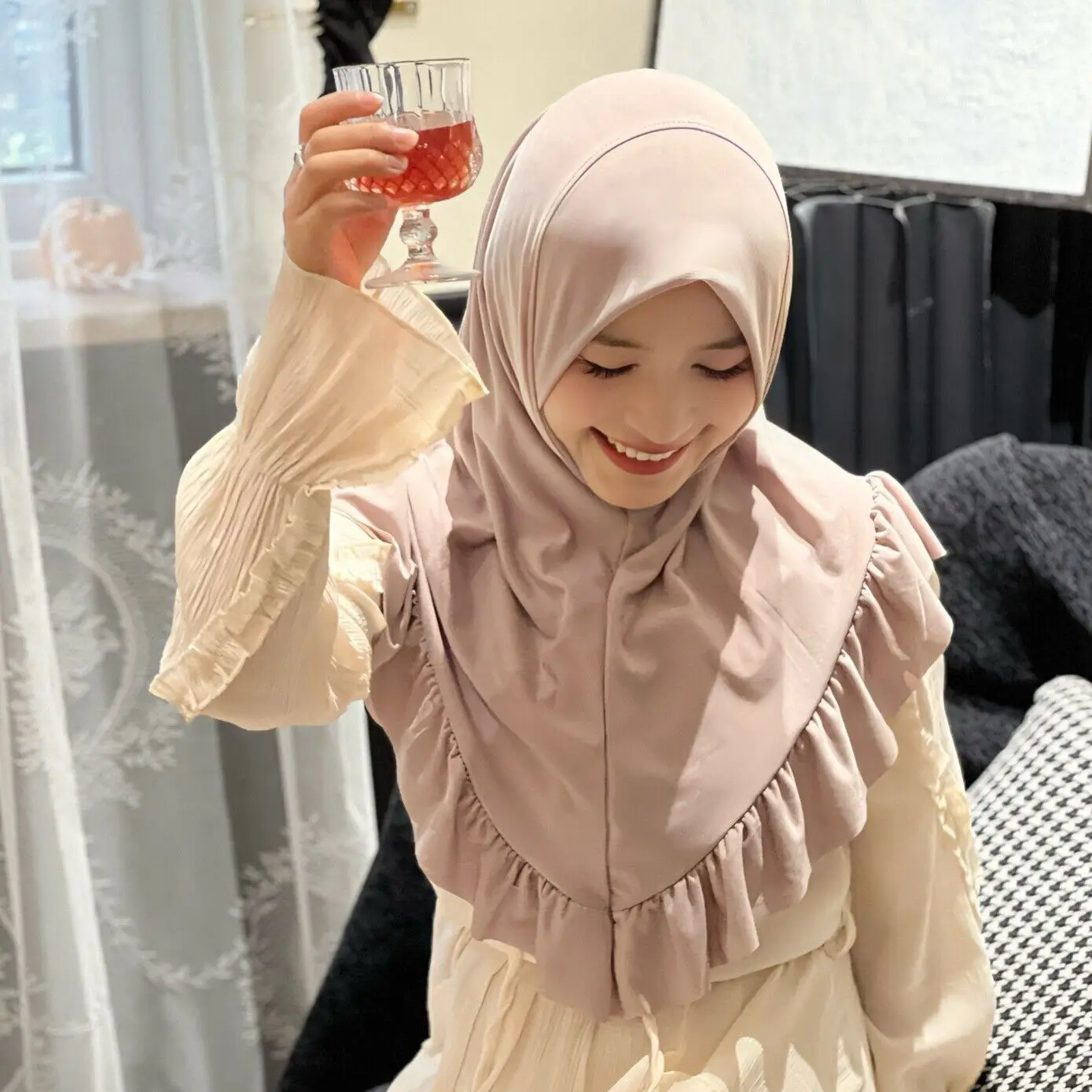 "J'ai été très satisfait de l'achat de ce hijab musulman. La qualité du tissu est excellente, il est doux et agréable à porter. J'apprécie particulièrement le style élégant avec les volants qui lui donnent une belle forme. La seule petite déception a été que la taille ne correspondait pas parfaitement à mes attentes, mais avec quelques ajustements, il s'est finalement très bien adapté. Dans l'ensemble, c'est un produit de belle facture que je recommande sans hésiter."